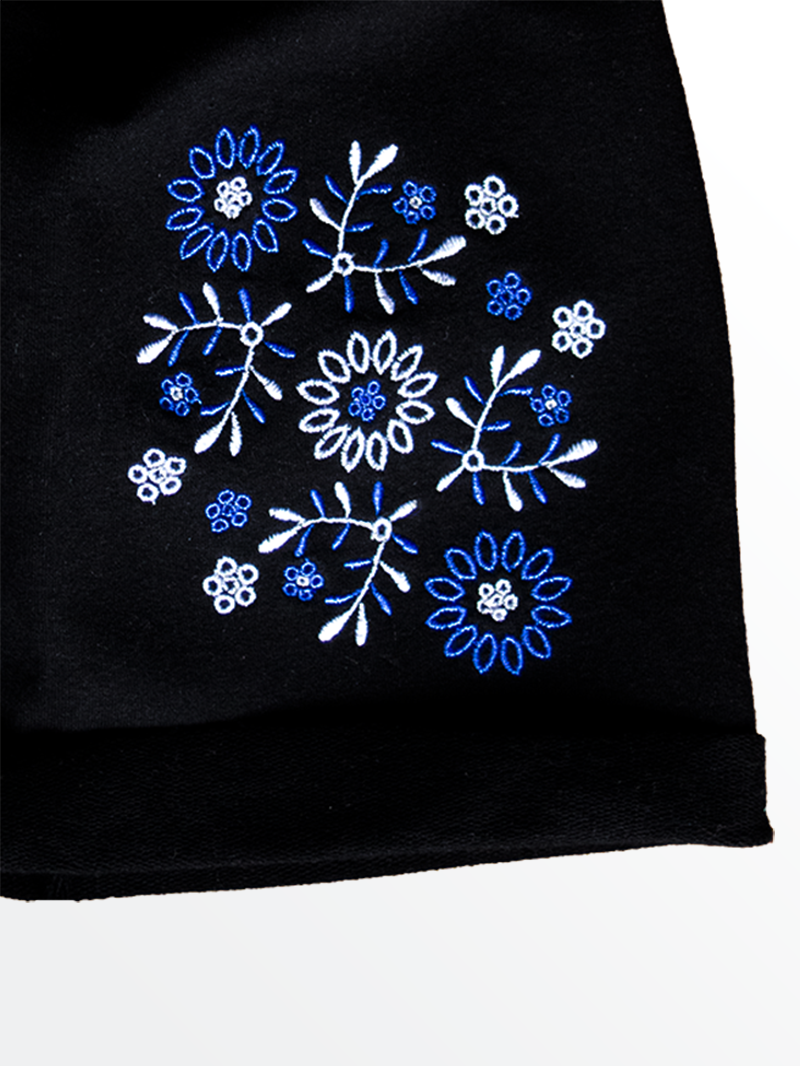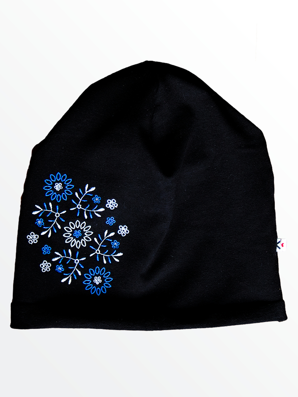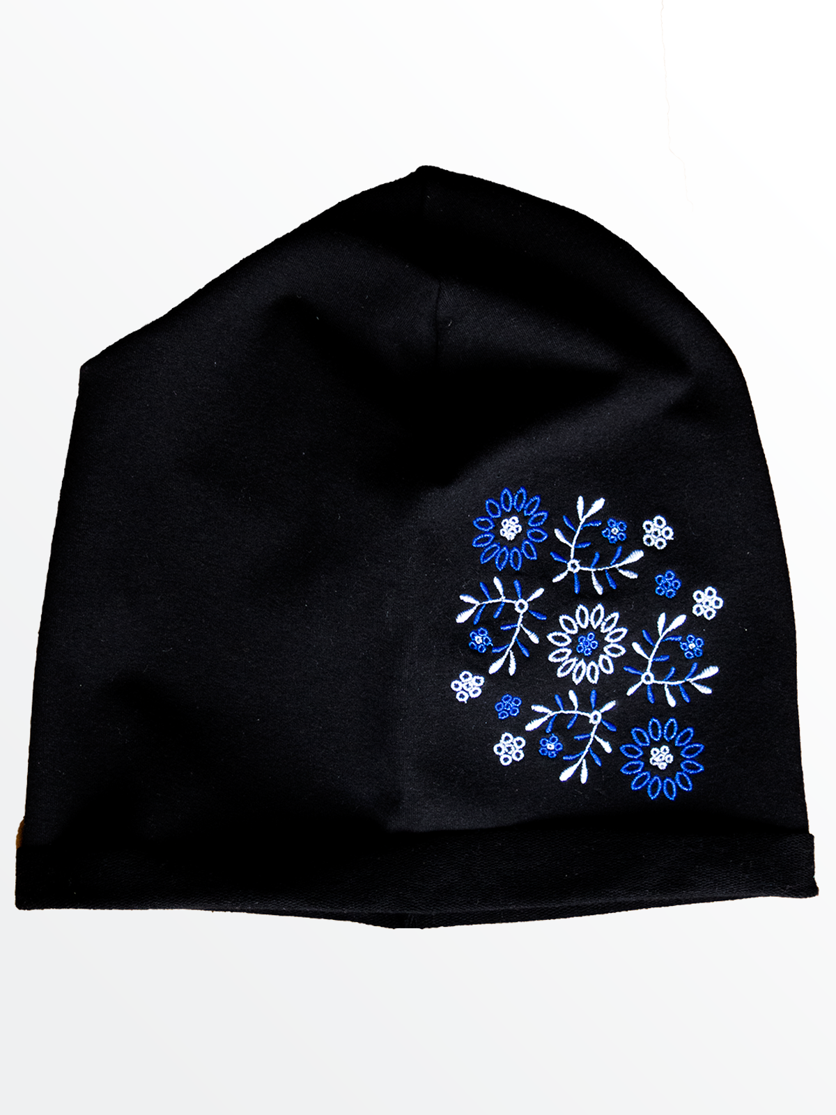 Czapka uszyta z elastycznej dzianiny w czarnym kolorze. Bok czapki jest ozdobiony haftowanym motywem, który pochodzi z regionalnych strojów Krakowiaków Zachodnich. Motyw został wykonany białą i niebieską nicią. Rozmiar czapki jest uniwersalny (dzięki rozciągliwej dzianinie). Jeśli interesuje Cię czapka z innym haftem lub haft w innym kolorze, wejdź na tę stronę i uzupełnij formularz kontaktowy.