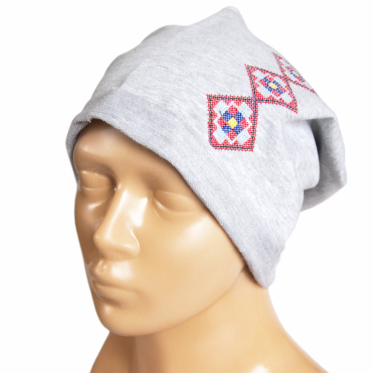 Jasnoszara czapka, ozdobiona kolorowym haftem. Motyw pochodzi z ludowych strojów z okolic Kielc. Czapka jest uszyta z jednej warstwy elastycznej dzianiny. Jeśli interesuje Cię czapka z innym haftem lub haft w innym kolorze, wejdź na tę stronę i uzupełnij formularz kontaktowy.