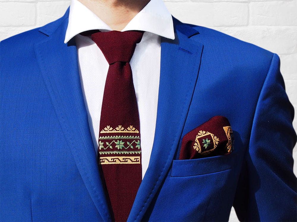 Ten krawat to połączenie klasyki męskich dodatków i ludowego charakteru w bardzo subtelnym wydaniu. Bordowy krawat ze dodatkiem złotego koloru to zestawienie, które sprawdza się od lat w formalnych stylizacjach. Krawat jest ozdobiony dwoma pasami haftu, pochodzącego z łódzkich strojów regionalnych. Krawat możesz również kupić w zestawie z poszetką i spinkami do mankietów. |