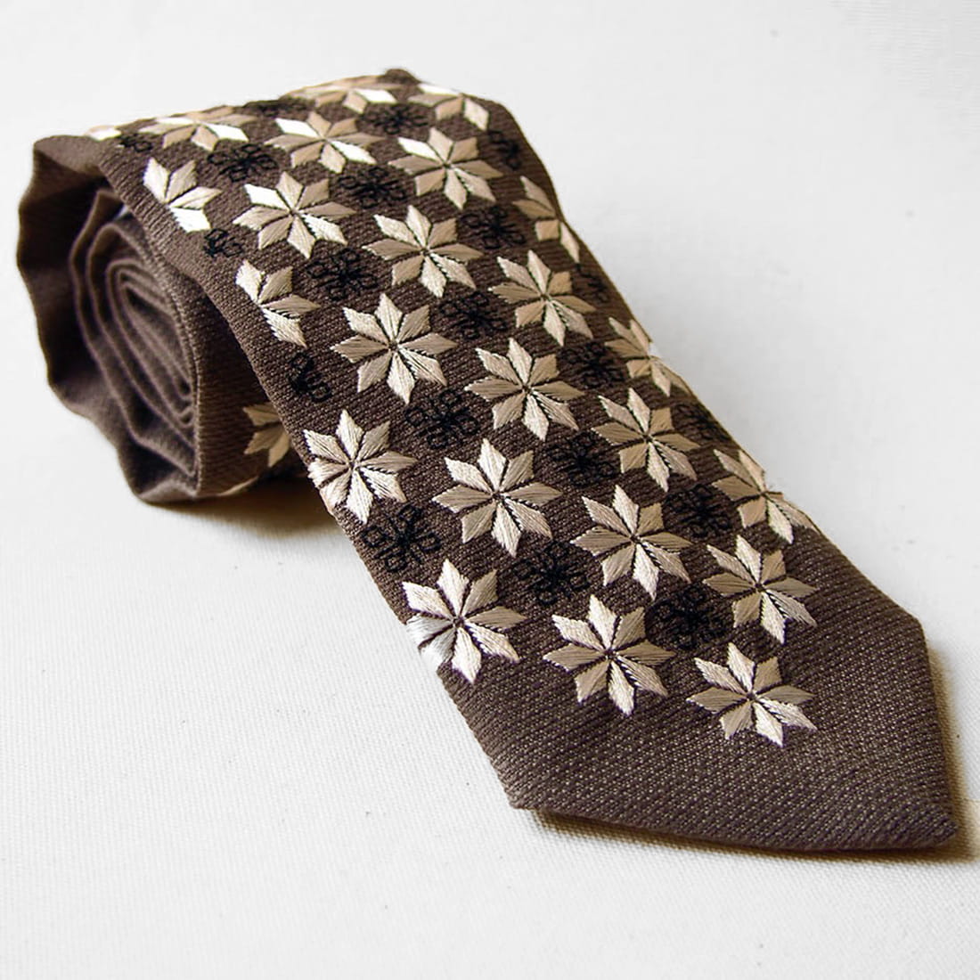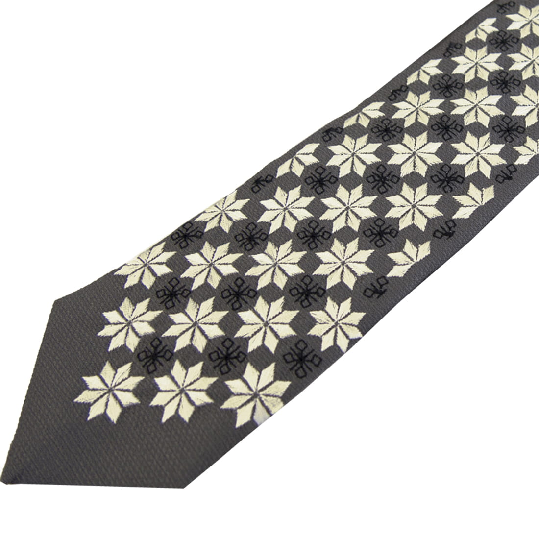 Elegancki krawat w starym stylu. Krawat uszyliśmy z ciemnopopielatej tkaniny i ozdobiliśmy bardzo efektownym haftem z Podlasia w kolorze beżowym. Tego rodzaju zdobienie nazywano haftem tkackim, czyli tzw. pereborami. Były układane w ornament poziomych pasów, biegnących przez szerokość tkaniny. |