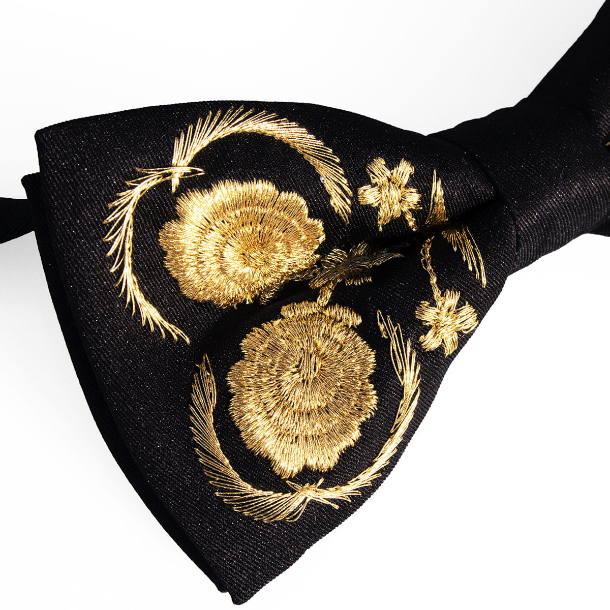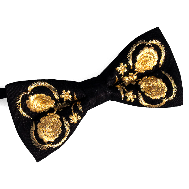Klasyczna podwójna mucha do garnituru w czarnym kolorze. Na czarnej tkaninie umieściliśmy haft z regionu kaszubskiego. Motyw został wyszyty złotą nicią, w zgodzie z oryginalną techniką haftu kaszubskiego.Ten rodzaj haftu był tradycyjnie wykonywany złotą, niekiedy jedwabną nicią i ozdabiał kobiece czepce. Matuulowa wersja kaszubskiego haftu zawiera popularne na Kaszubach motywy zdobnicze, takie jak tulipany, dzwonki, serca. Mucha została wykonana ręcznie i posiada regulację zapięcia. |