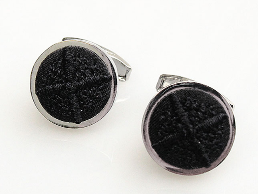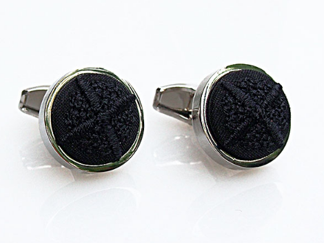 Spinki do mankietów ozdobione haftem z regionu kaszubskiego. Czarna nitka haftu delikatnie wyróżnia się na czarnym tle. Spinki można kupić osobno lub w zestawie z muchą.