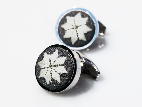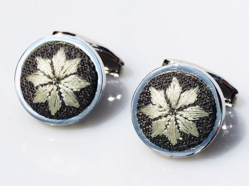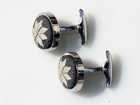 Elegancki dodatek do męskiej koszuli. Spinki do mankietów w stonowanych kolorach, zostały ozdobione regionalnym haftem. Wzór pochodzi z Podlasia, z okolic Włodawy. Spinki można dopasować do krawata z tym samym wzorem.