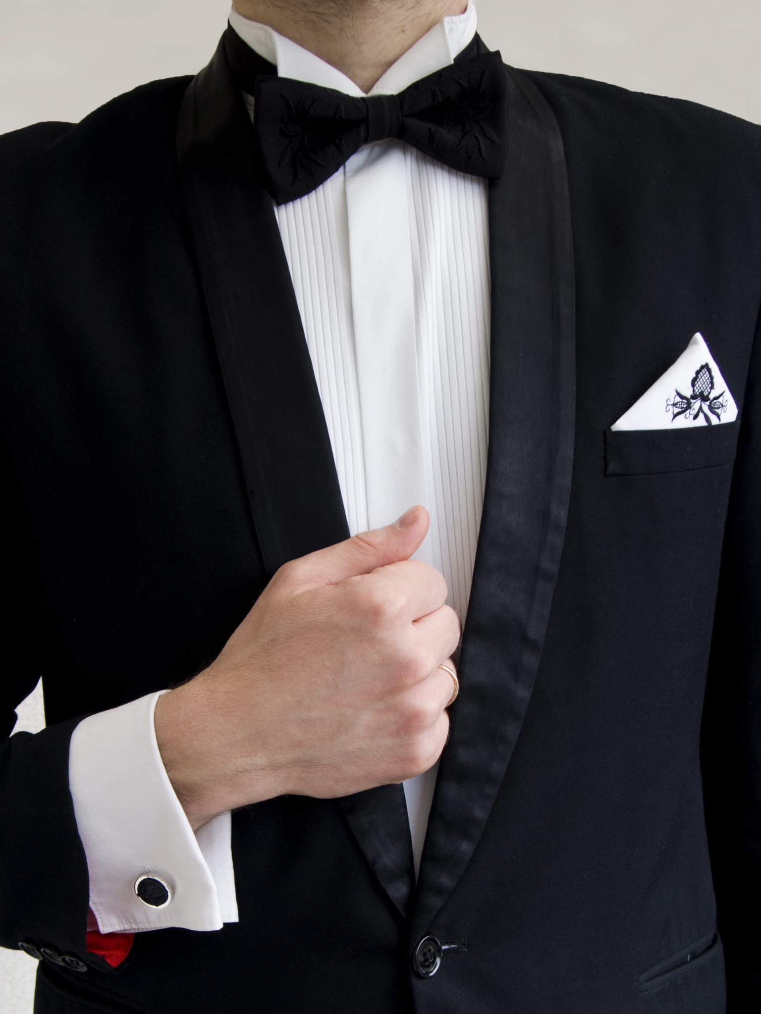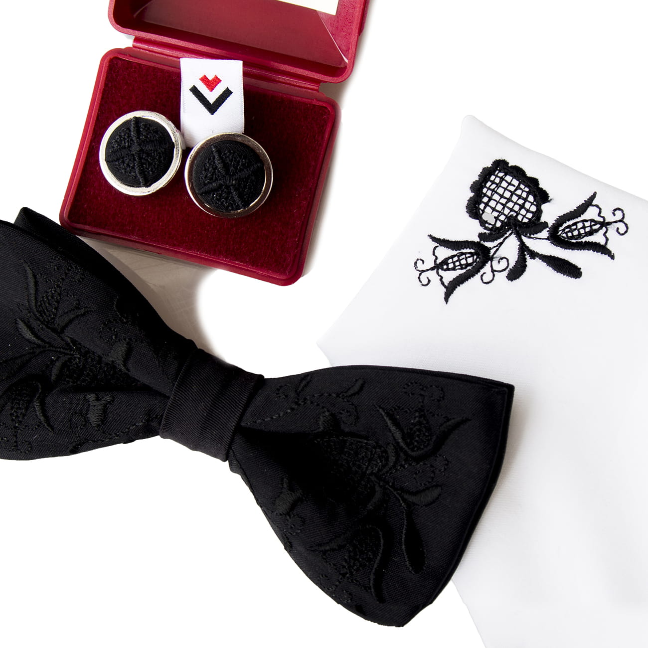 Elegancki zestaw do garnituru, w którego skład wchodzi: mucha, spinki do mankietów oraz poszetka uszyta z tego samego materiału. Każdy element jest ozdobiony regionalnym haftem kaszubskim. Ręczne wykonanie gwarantuje doskonałą jakość. Komplet jest zapakowany w eleganckie prezentowe pudełko. Mucha posiada regulowane zapięcie. Bazy spinek są wykonane z mosiądzu w srebrnym kolorze. |