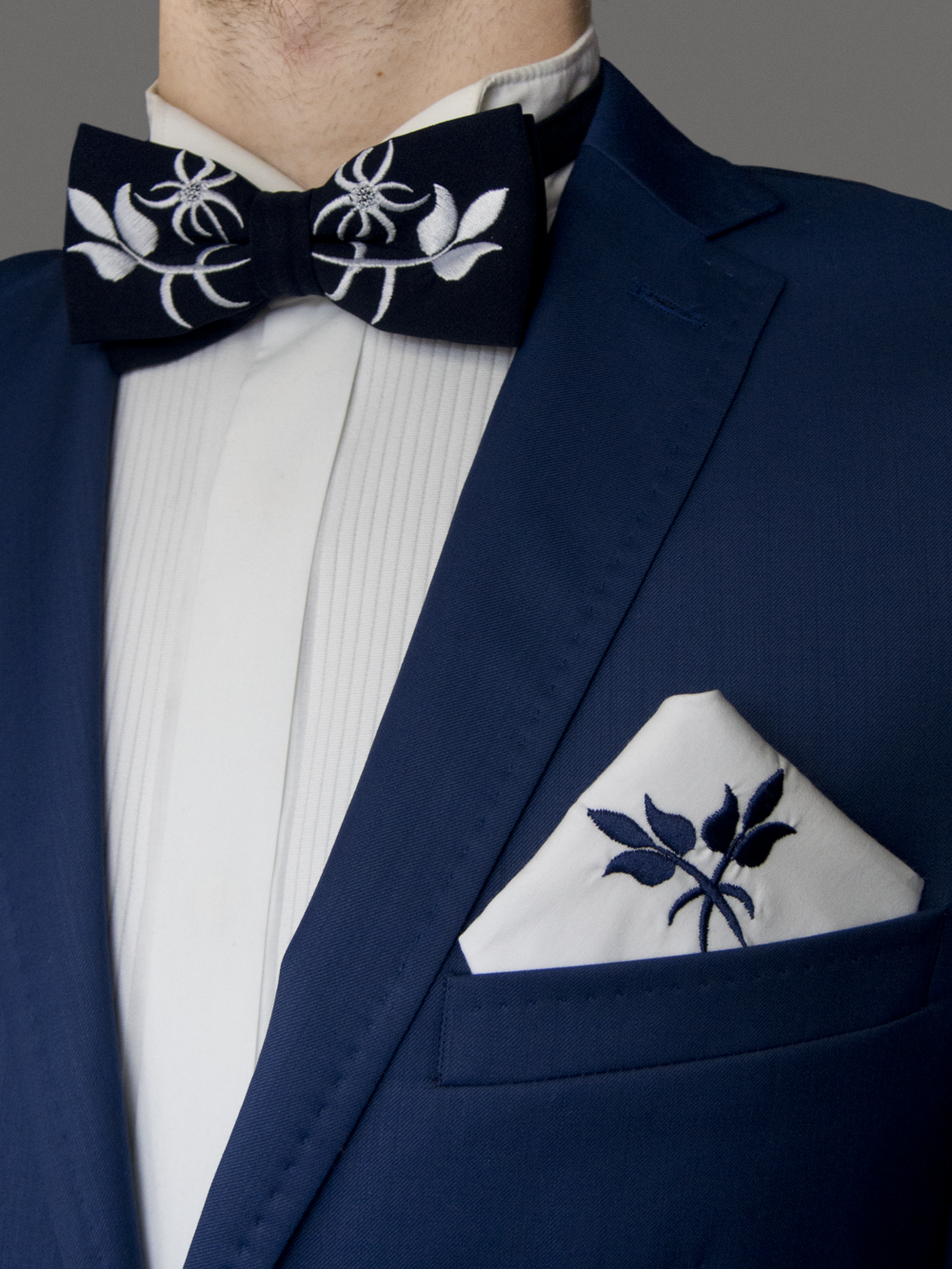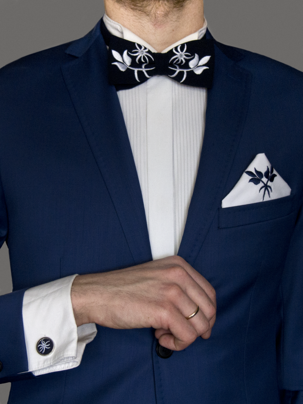 Zestaw, którego bazą jest haft pochodzący ze strojów Górali Podhalańskich. Mucha, poszetka oraz spinki do mankietów to dodatki do garnituru, które ożywią i urozmaicą formalną stylizację. Haftowany wzór to tzw. dziewięćsił, przypominająca oset roślina rosnąca w Tatrach. Dziewięćsił występował najczęściej jako haftowany motyw na przodach cuch. Oryginalne kolory to zieleń, czerwień i żółć. W naszej wersji te kolory zastąpione są stonowanym, klasycznym połączeniem. Mucha została wykonana ręcznie i posiada regulowane zapięcie. Komplet jest zapakowany w eleganckie prezentowe pudełko. Elementy można kupić osobno lub połączyć w zestaw. Mucha posiada regulowane zapięcie. Bazy spinek są wykonane z mosiądzu w srebrnym kolorze. |