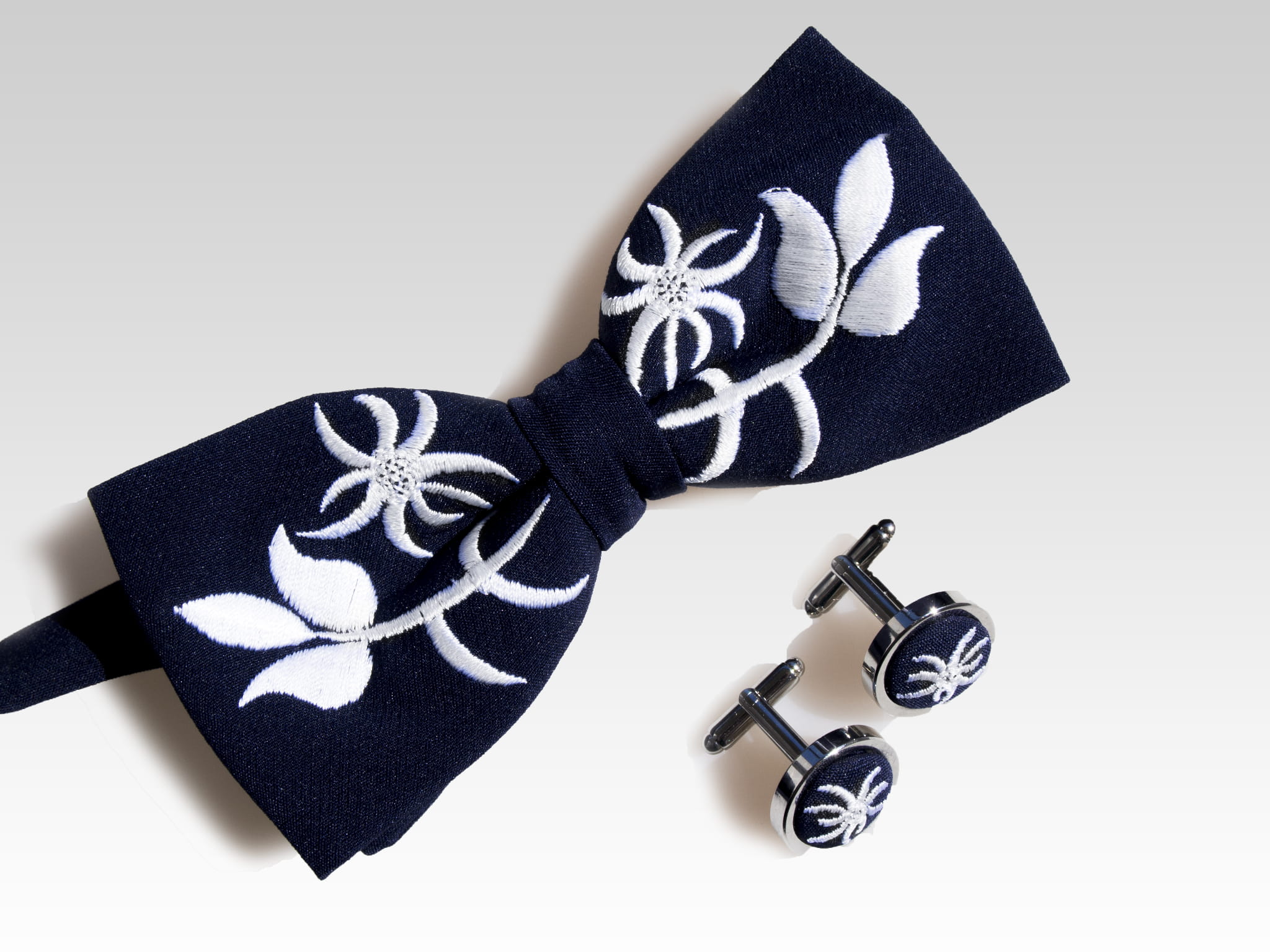 SZCZEGÓŁY: Krój: Mucha gotowa, dwuwarstwowa. Wymiary kokardy: szerokość ok. 12 cm; wysokość ok. 6 cm. Regulowane zapięcie Spinki: Bazy spinki w srebrnym kolorze, wykonane z mosiądzu, bez dodatku niklu, ołowiu i kadmu. Średnica wewnętrzna spinki: 15 mm Poszetka: ok. 30 x 30 cm, na lewej stronie znajduje się zabezpieczenie haftu |