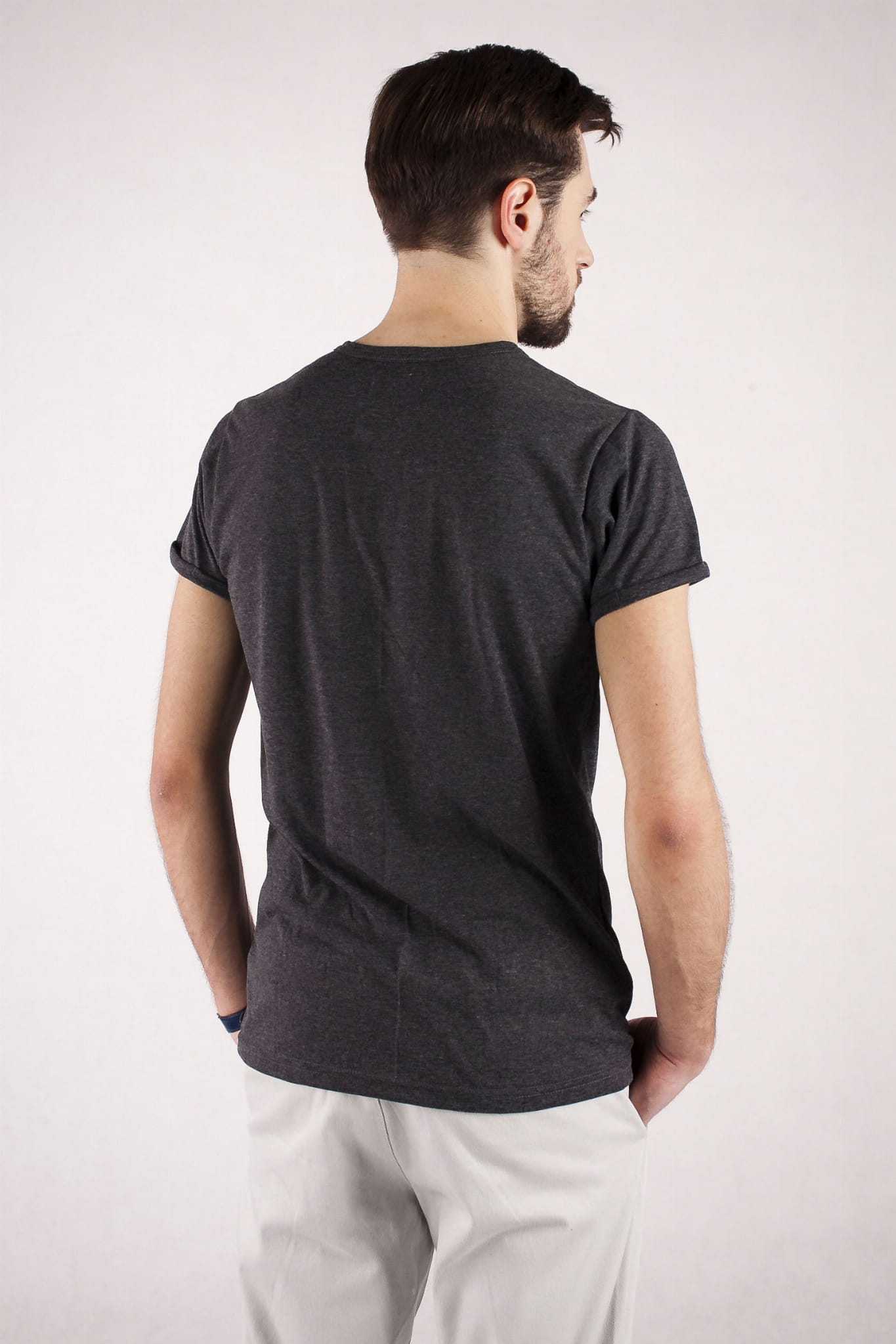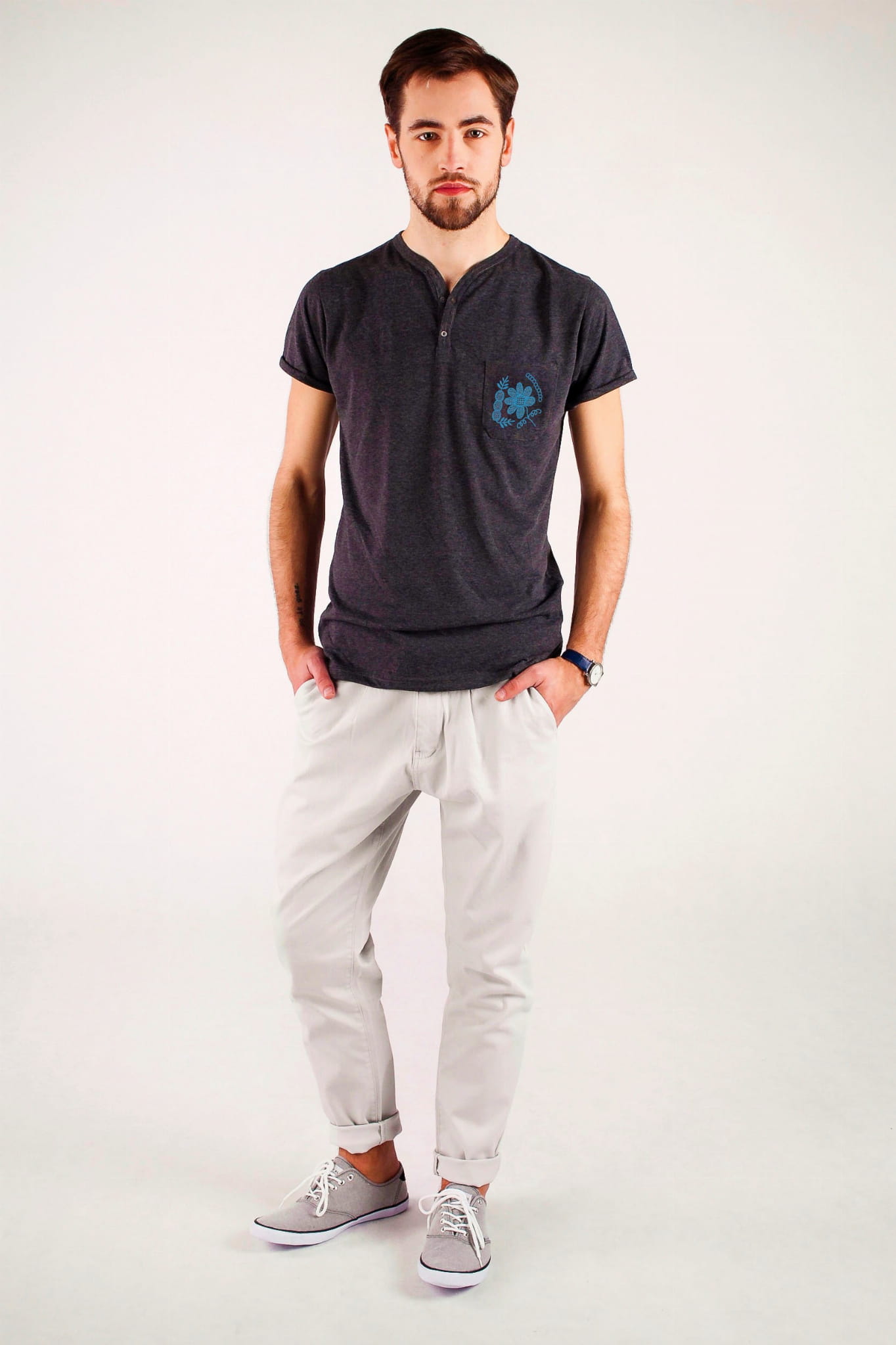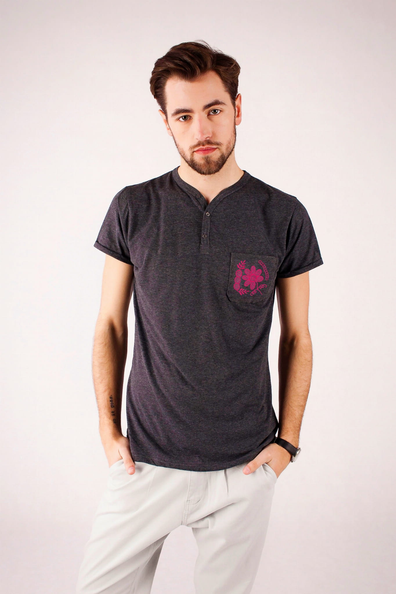 Grafitowa koszulka uszyta z bawełnianego melanżu. Kieszonkę ozdobiliśmy haftem pochodzącym z Górnego Śląska. Najbardziej rozpowszechnione na tym obszarze stroje to stroje rozbarskie i bytomskie. W naszej wersji intensywnie zielona nić tworzy na materiale misterną siateczkę, wypełniającą kwiatowy motyw. Wykończenie dekoltu w kształcie litery V jest dopełnione drobnymi guziczkami. Delikatnie taliowany krój, elegancki kolor i zdobienie na kieszonce tworzą razem doskonałą całość! |