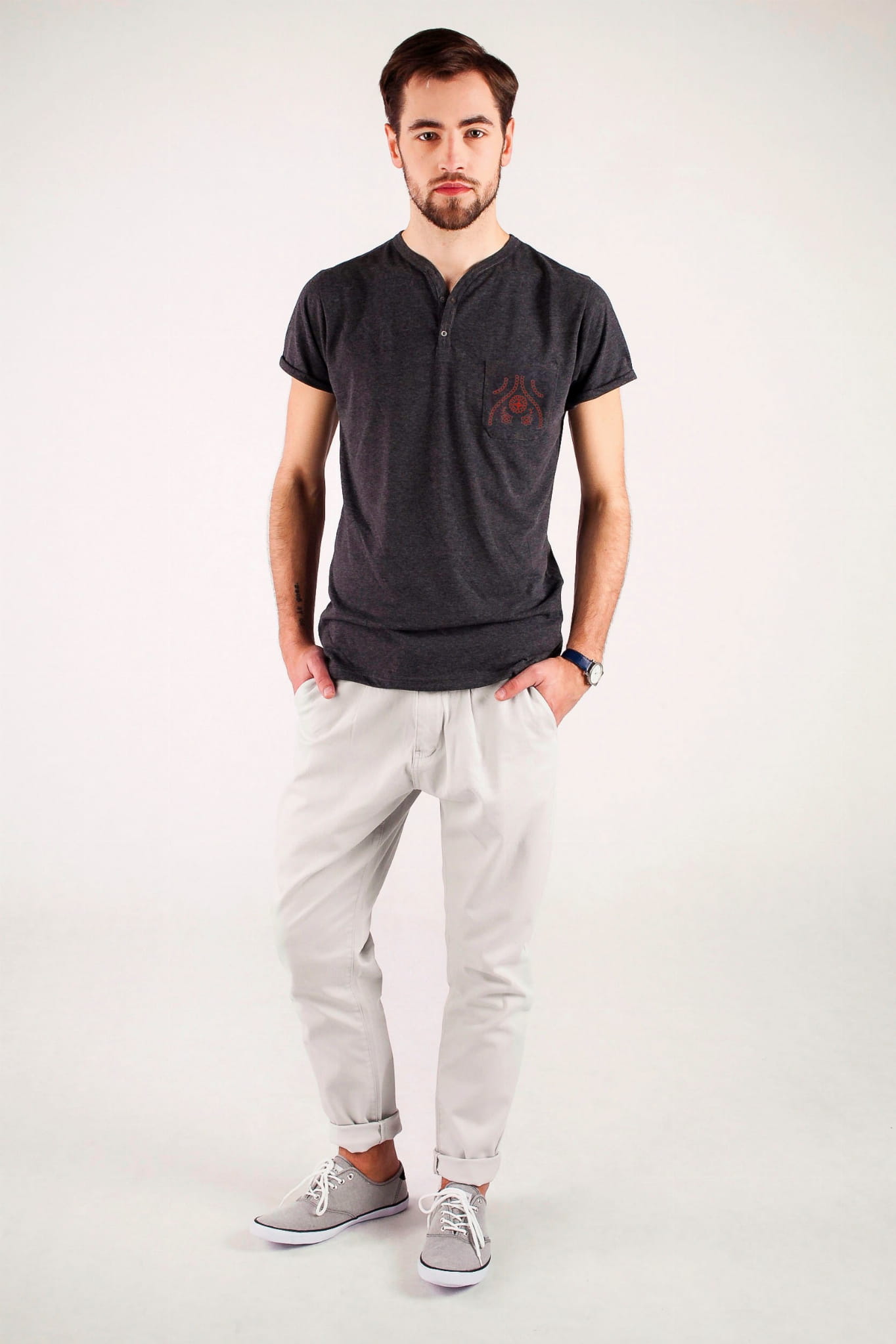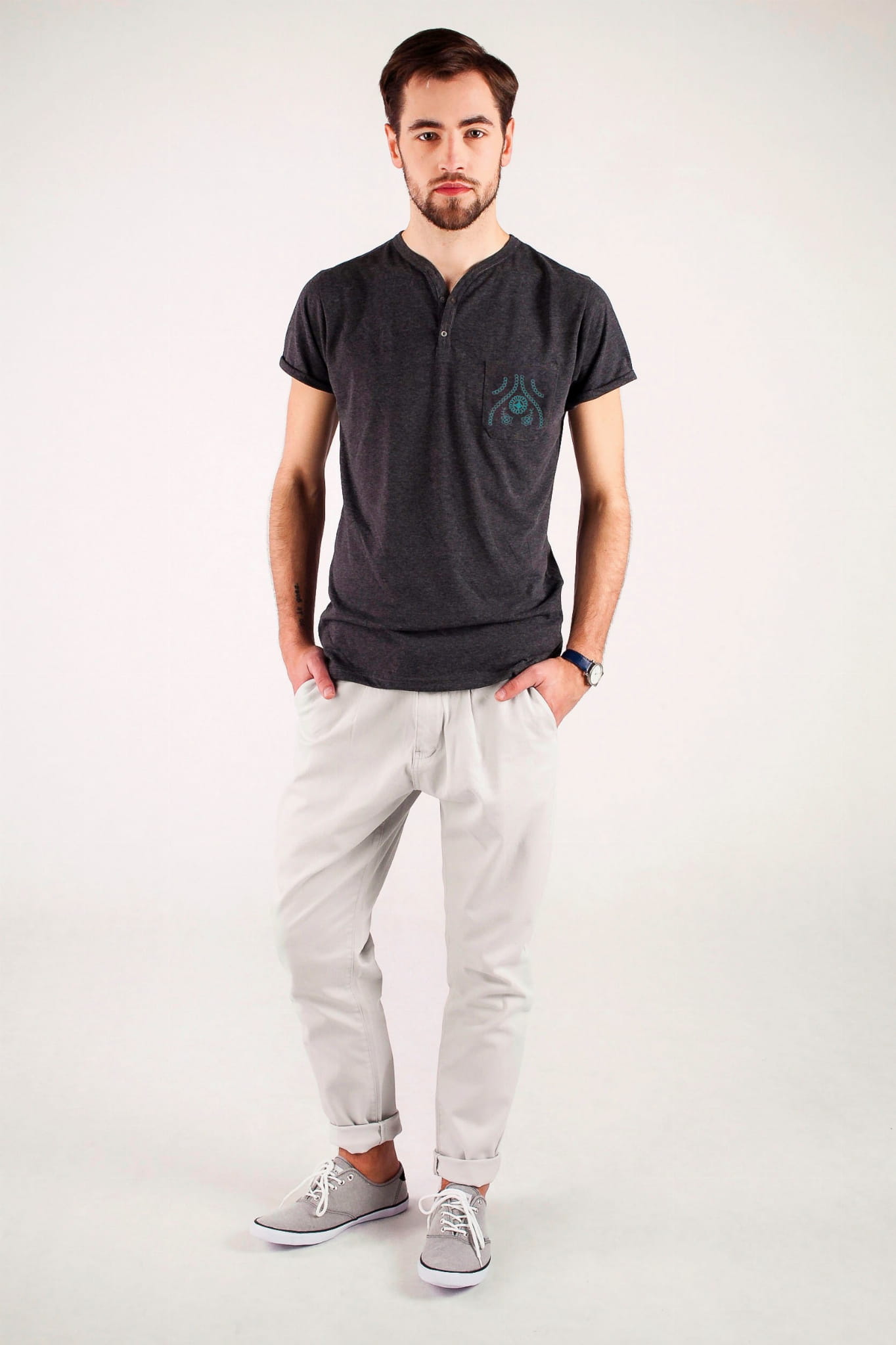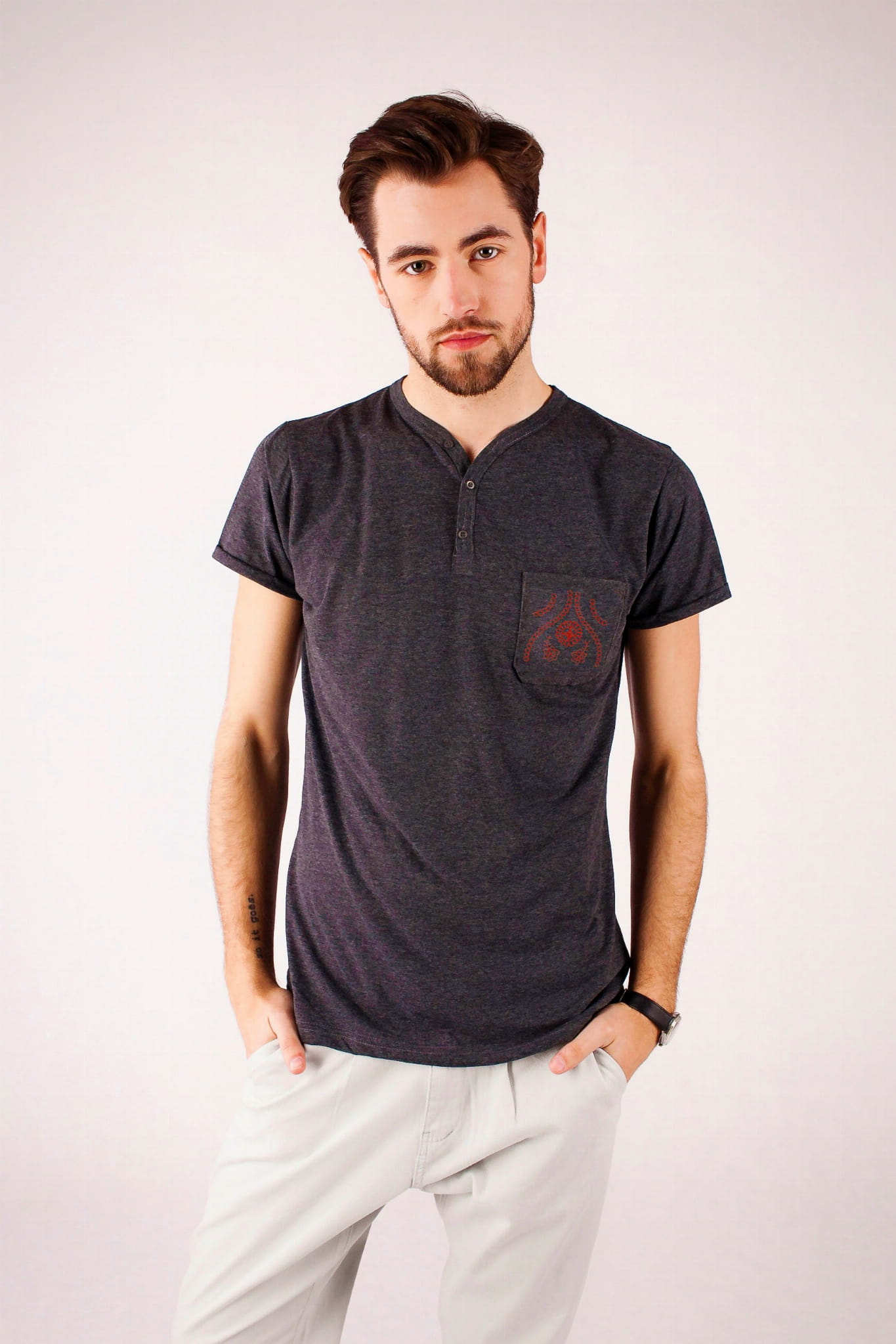Wygodny i elegancki t-shirt, który doskonale uzupełni twoje letnie stylizacje. Jego najważniejszym elementem jest haftowana kieszonka. Znajduje się na niej haft, pochodzący z regionu wielkopolskiego (Szamotuły). Pierwotnie takie wzory były wykonywane na tiulu, my umieściliśmy je w nowoczesnym kontekście. Wzór jest dostępny w kilku wariantach kolorystycznych. Koszulka jest uszyta z bawełny 100%, ma lekko taliowany krój i dekolt typu V-neck. T-shirt należy do kolekcji Regiony Polski. |