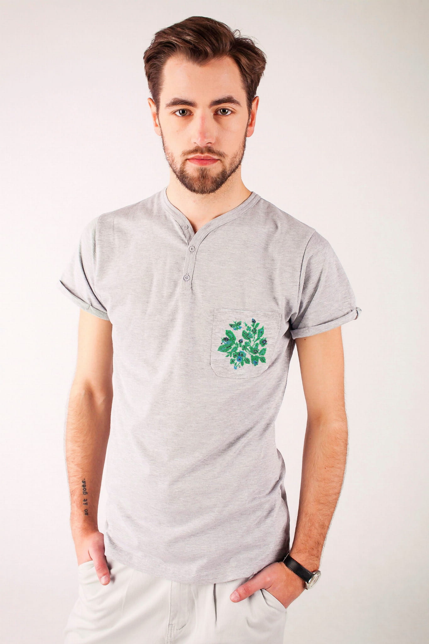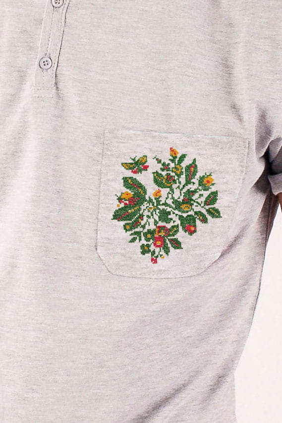Koszulka z krótkim rękawem to jeden z podstawowych elementów męskiej garderoby. Zadbaj o to, żeby twoja była jednocześnie uniwersalna i wyjątkowa. Dekolt wykończony w kształt litery V, zapinany na drobne guziki. Na kieszonce znajduje się wzór z regionu hrubieszowskiego. Na tym obszarze Polski koszule było bogato zdobione, za pomocą wielobarwnych haftów krzyżykowych, pokrywających duże połacie materiału (najczęściej przody koszul lub kobiece zapaski). My również skorzystaliśmy z tej techniki, zmieniając kolorystykę na bardziej stonowaną. Koszulka jest uszyta z bawełny 100%, z delikatnym melanżem. Motyw na kieszonce intryguje i przyciąga wzrok. |