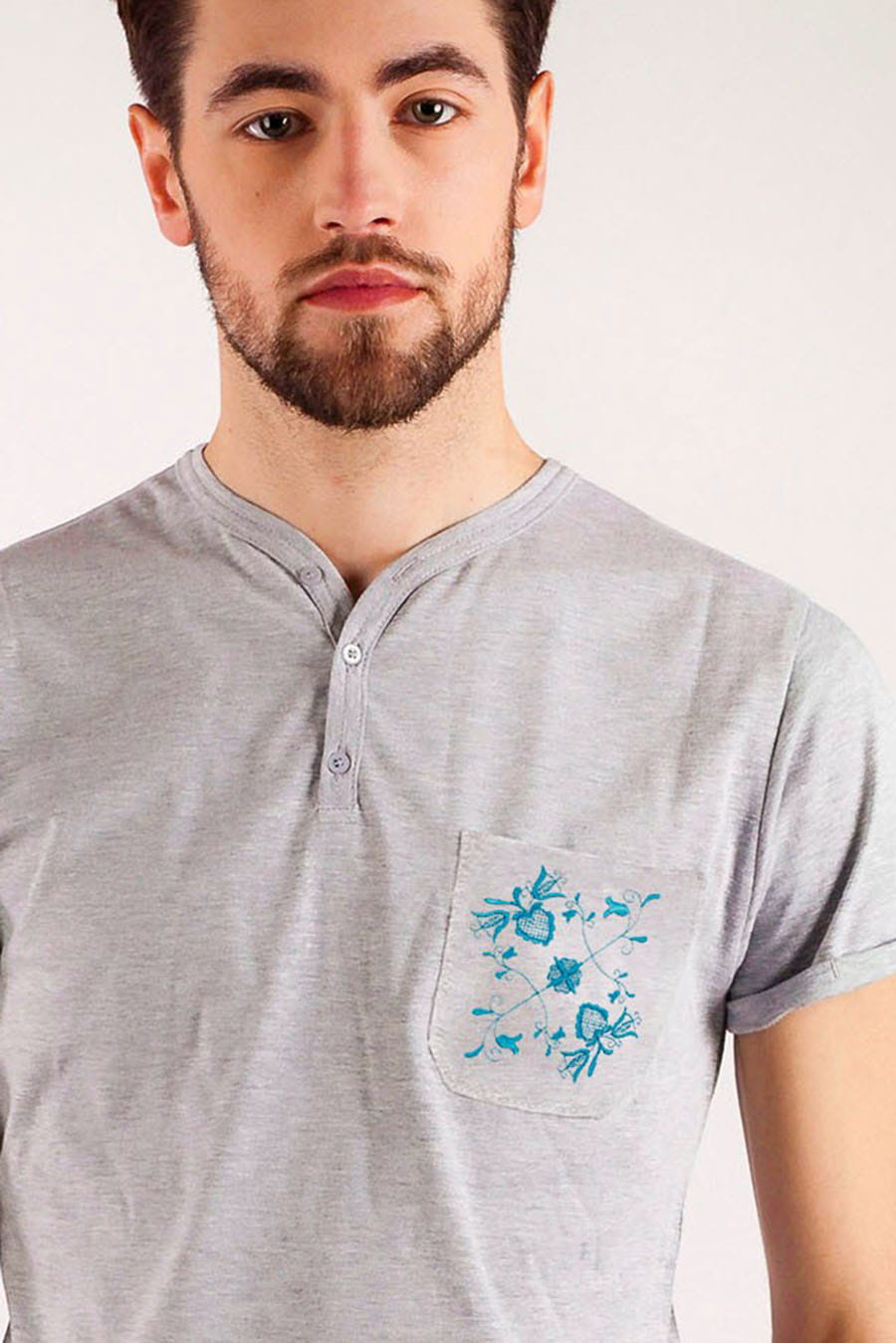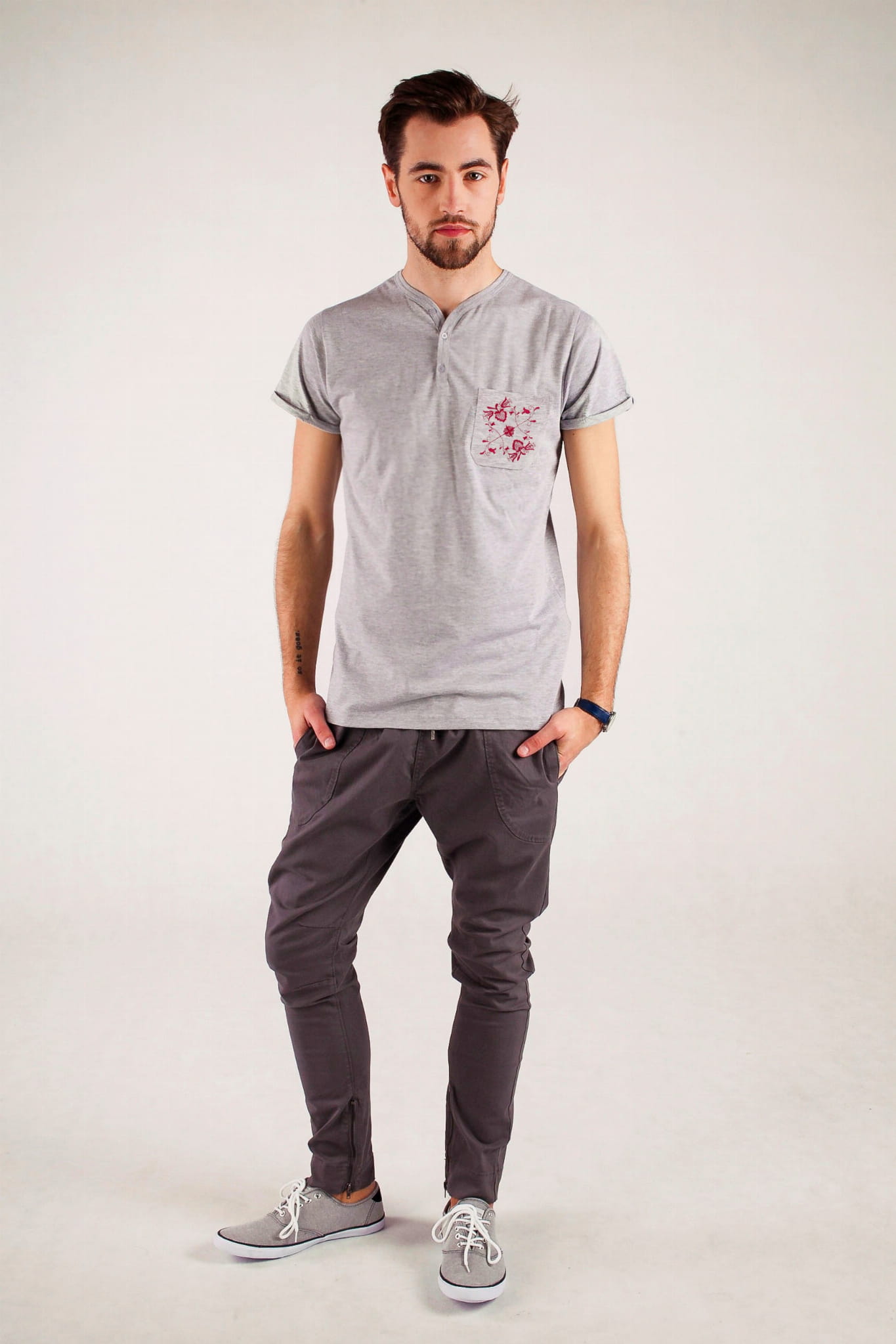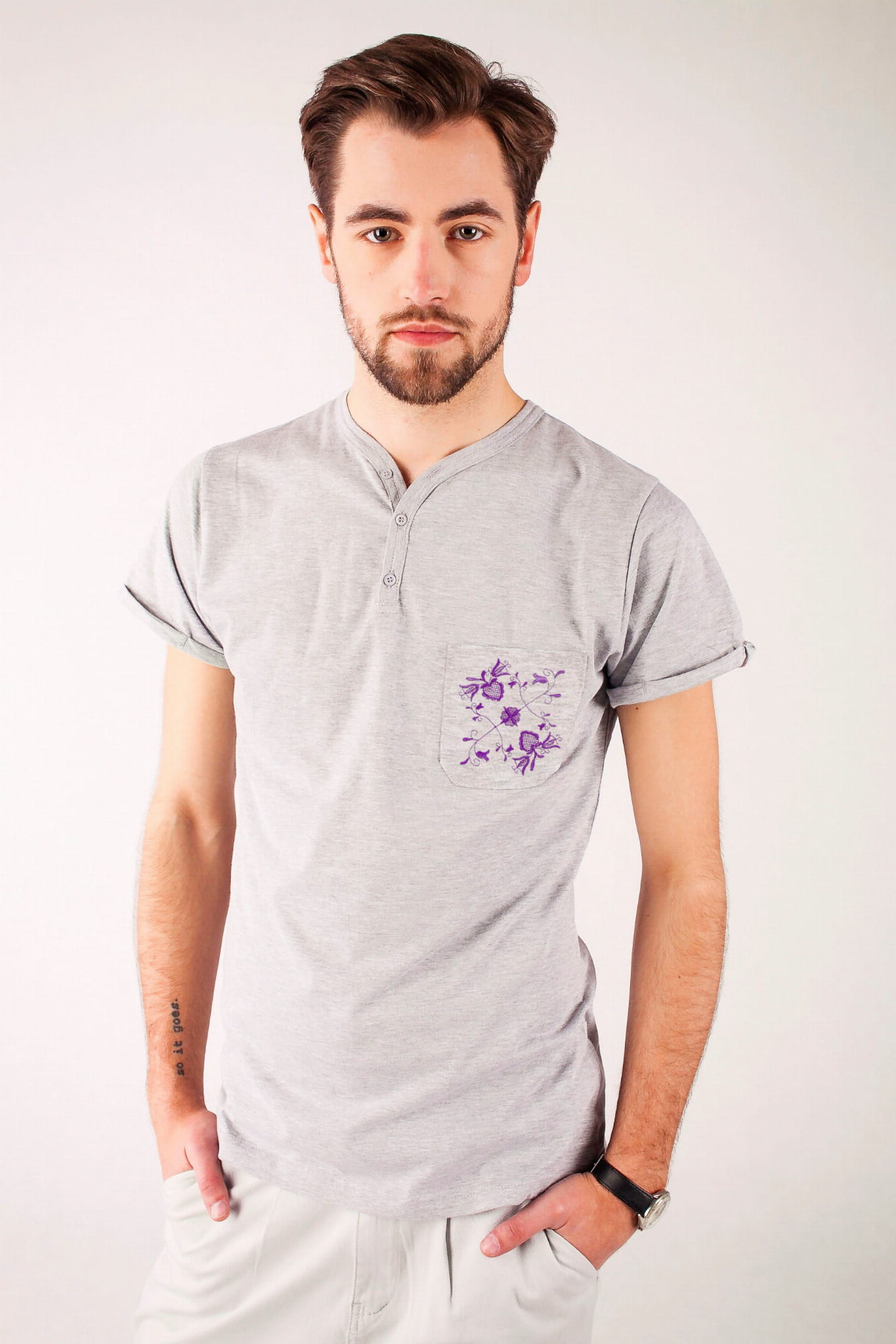 Szara koszulka to jeden z najbardziej uniwersalnych elementów męskiej szafy. Nasza wersja to klasyczny krój taliowanego t-shirtu z dekoltem typu V-neck, zapinanym na guziki. Bawełna, z której jest uszyta koszulka to jasnoszary melanż. Kieszonkę ozdobiliśmy misternym haftem kaszubskim, który dodaje koszulce lekkości. Wybraliśmy jeden z mniej znanych motywów tego popularnego w całej Polsce haftu. W oryginale był on wykonywany jednym kolorem, złotą lub srebrną nicią, w odróżnieniu od typowych dla tego regionu kolorów, czyli niebieskiego, żółtego, zielonego i czerwonego. |