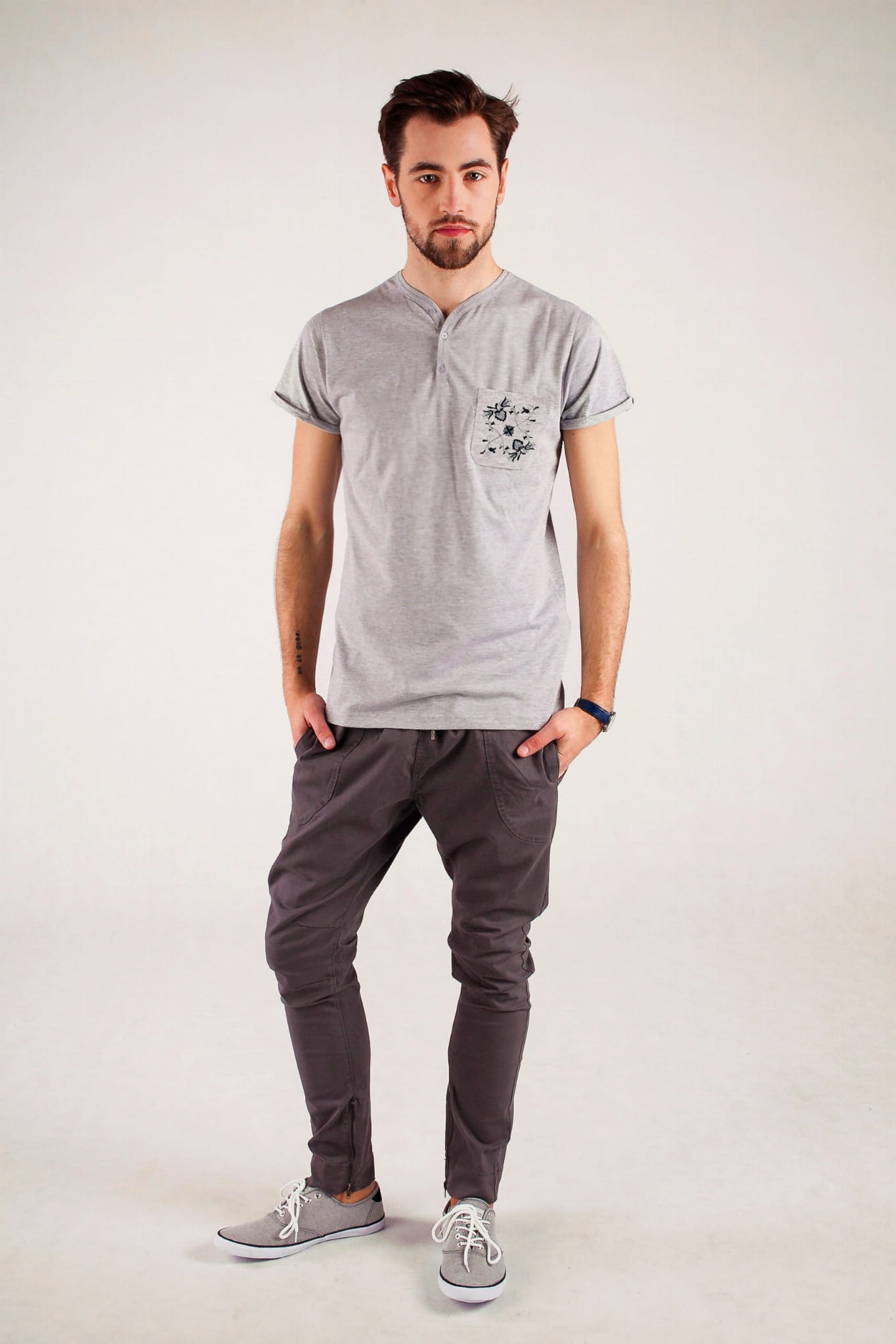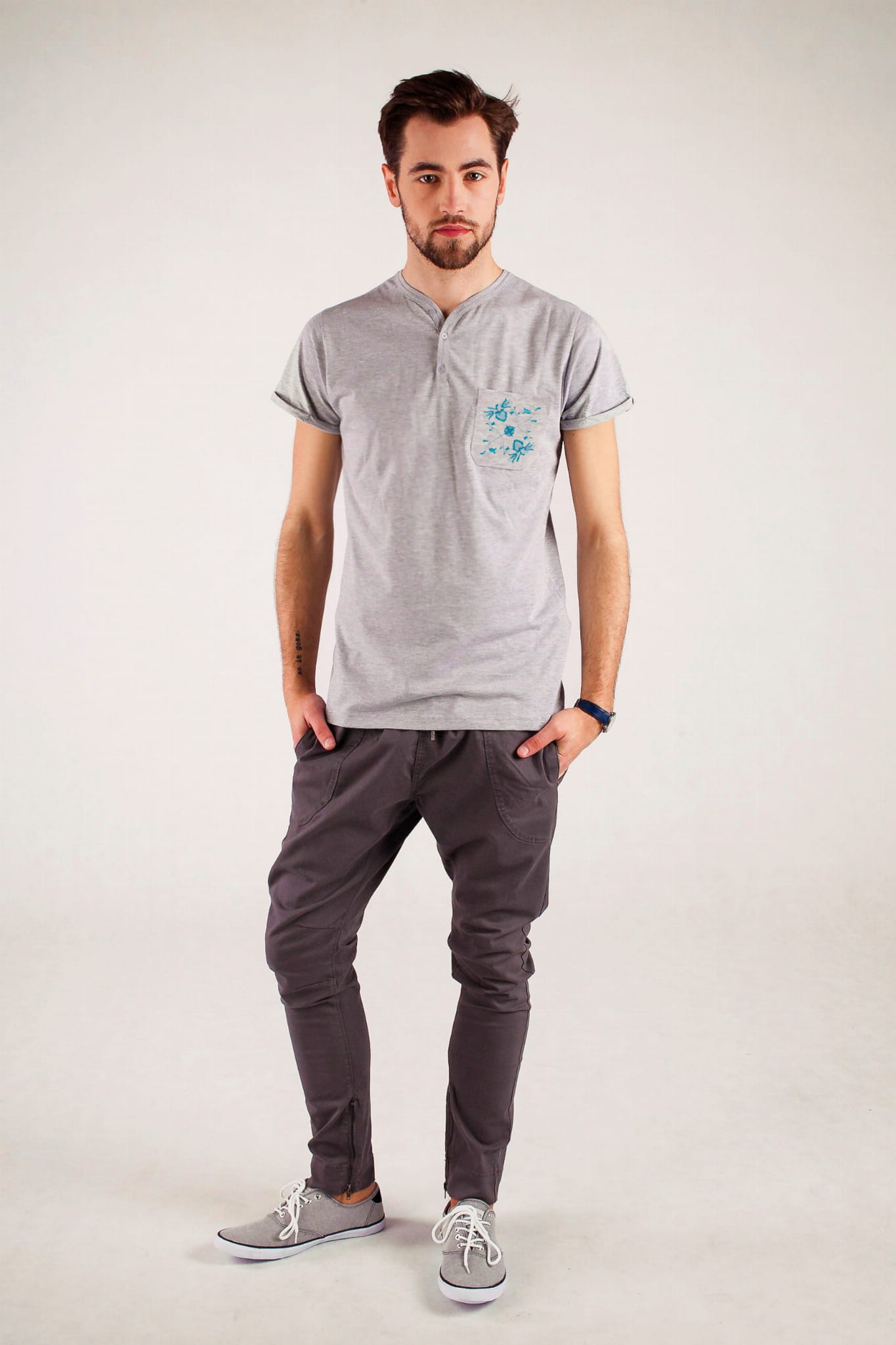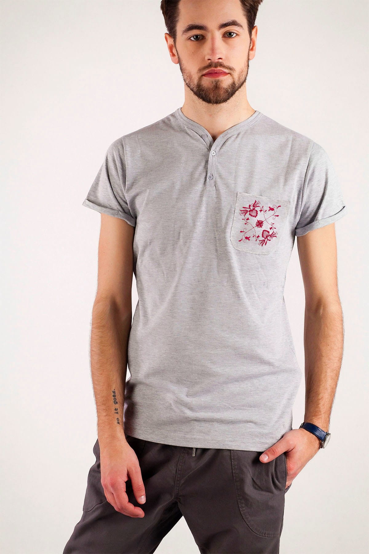 Szara koszulka to jeden z najbardziej uniwersalnych elementów męskiej szafy. Nasza wersja to klasyczny krój taliowanego t-shirtu z dekoltem typu V-neck, zapinanym na guziki. Bawełna, z której jest uszyta koszulka to jasnoszary melanż. Kieszonkę ozdobiliśmy misternym haftem kaszubskim, który dodaje koszulce lekkości. Wybraliśmy jeden z mniej znanych motywów tego popularnego w całej Polsce haftu. W oryginale był on wykonywany jednym kolorem, złotą lub srebrną nicią, w odróżnieniu od typowych dla tego regionu kolorów, czyli niebieskiego, żółtego, zielonego i czerwonego. |