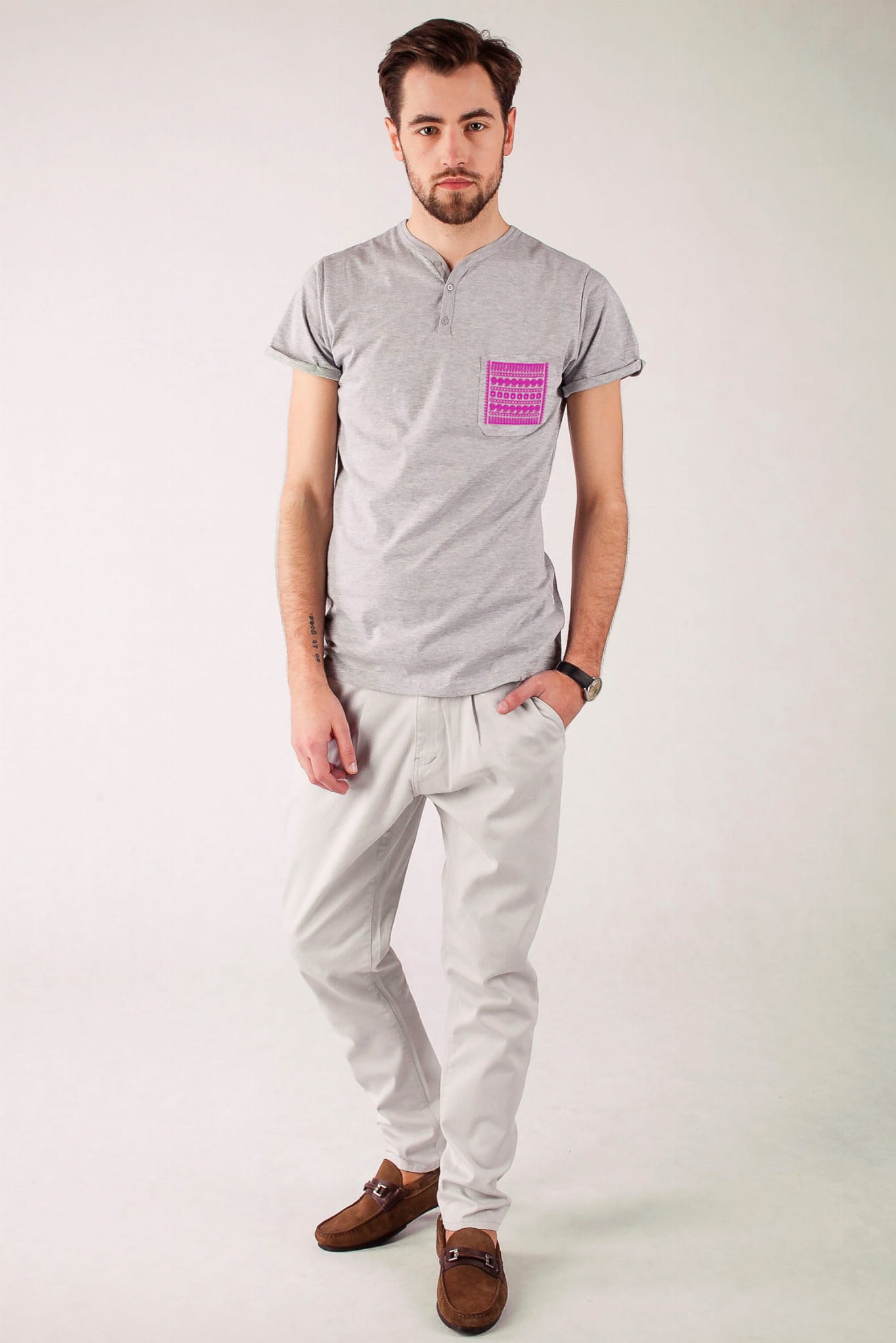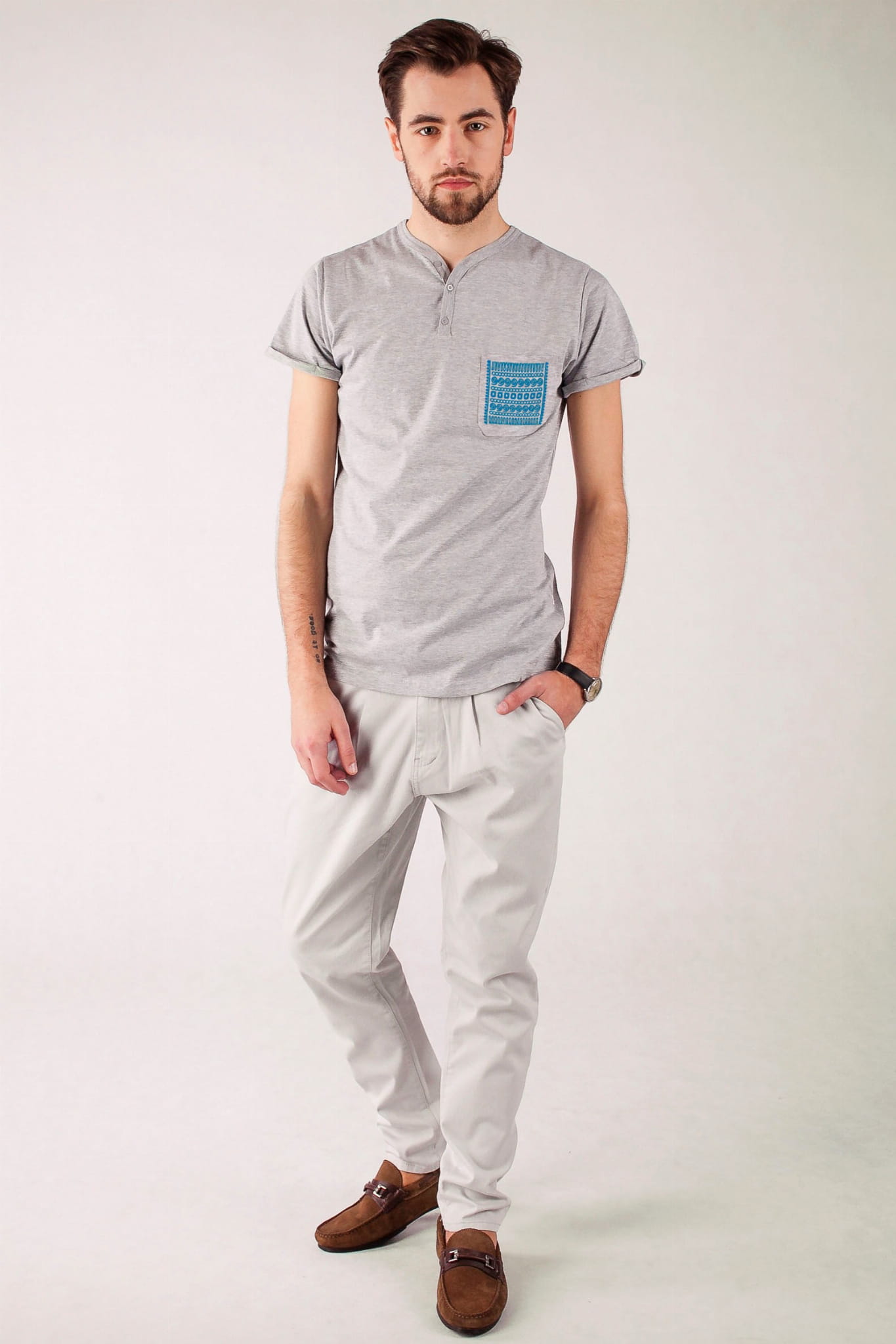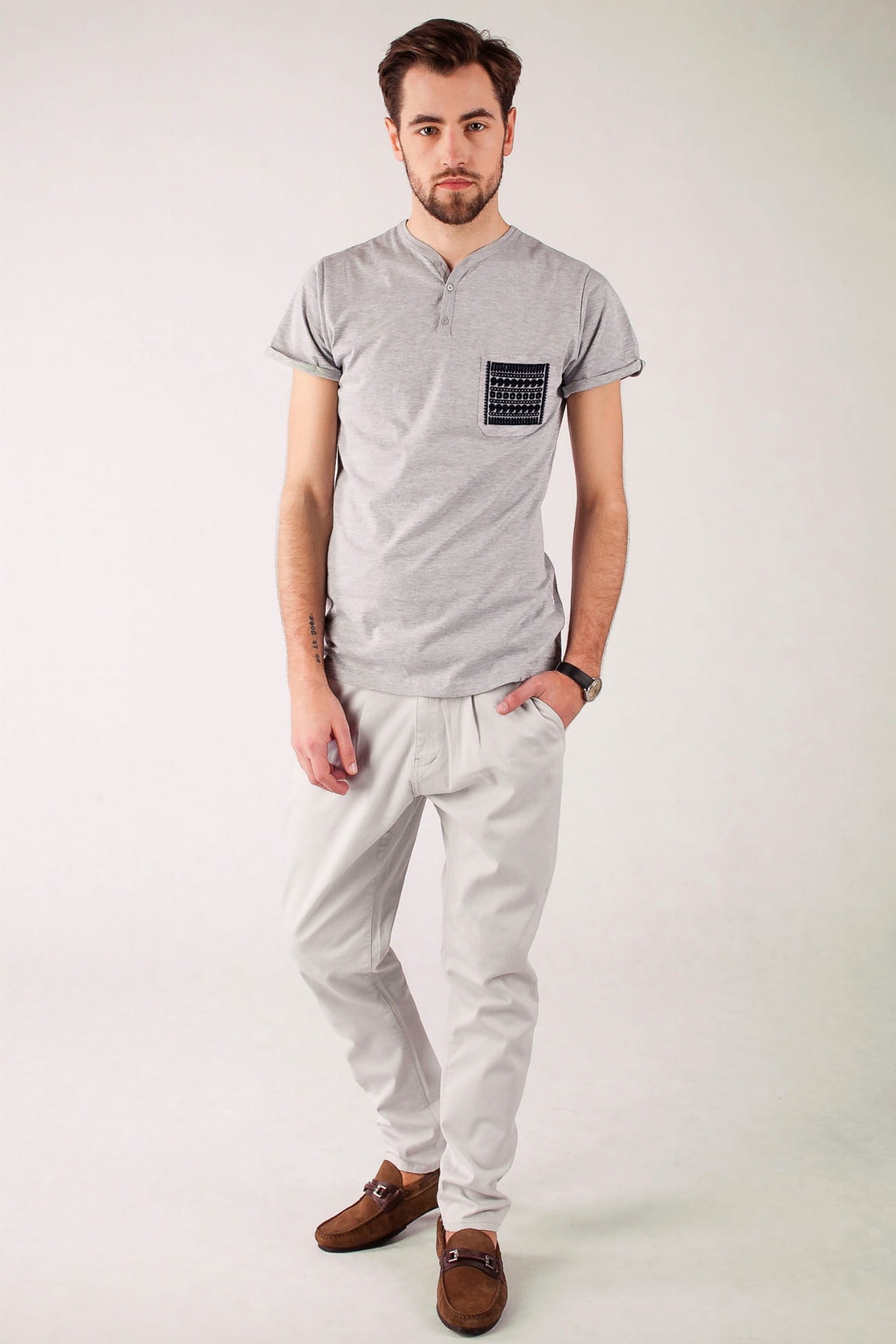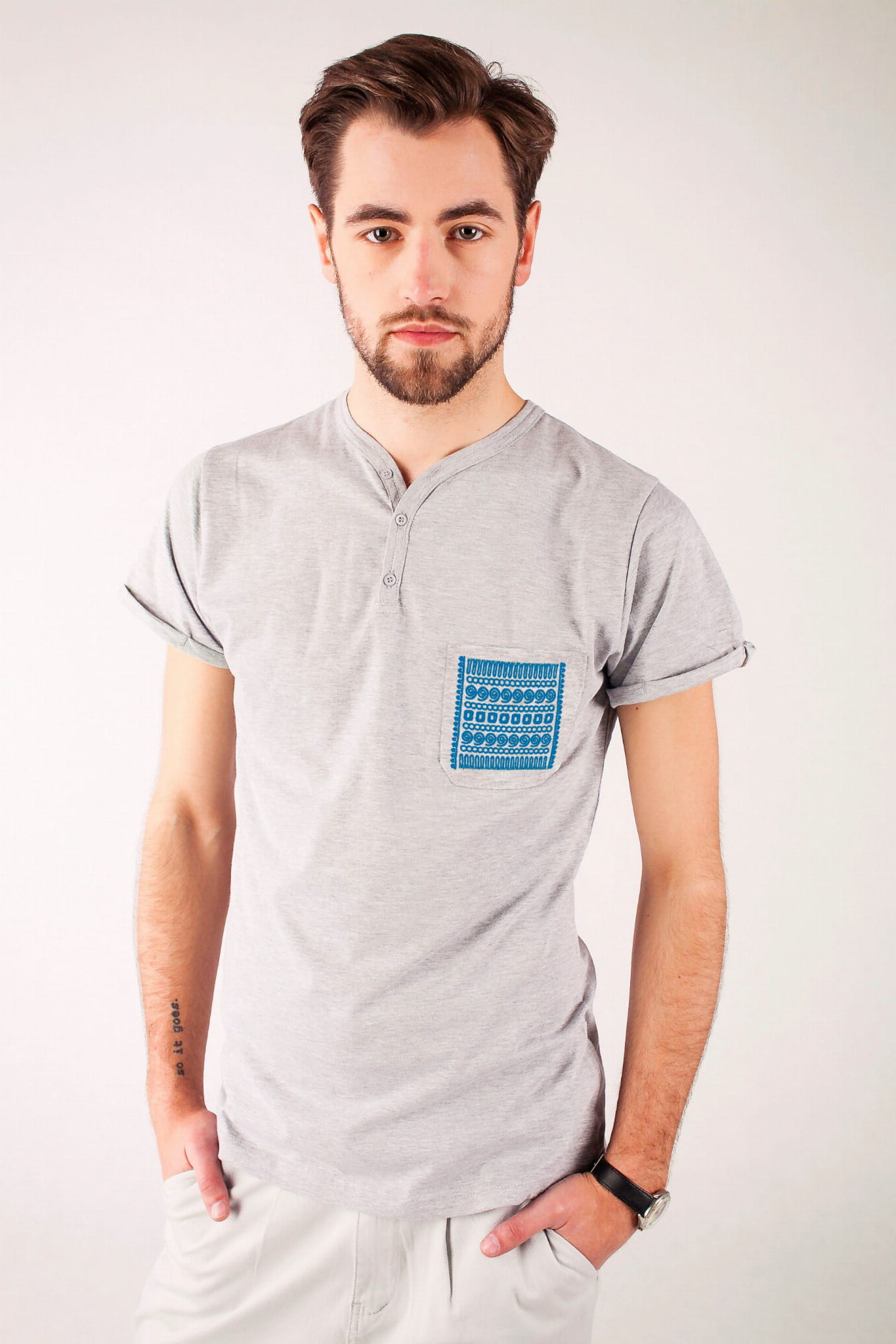 Koszulka typu V-neck z bawełny w szarym kolorze, z lekkim melanżem. Wzór pochodzi z regionu rzeszowskiego. Haft wypełnia kieszonkę pasami geometrycznych wzorów. Najczęściej spotykanymi na haftach z tego regionu kolorami były czerwień i granat. Nasz haft jest jednokolorowy, a do wyboru jest kilka wariantów. Koszulka jest uszyta z czystej bawełny - na pewno sprawdzi się w lecie, a przy tym naprawdę przykuwa wzrok! |
