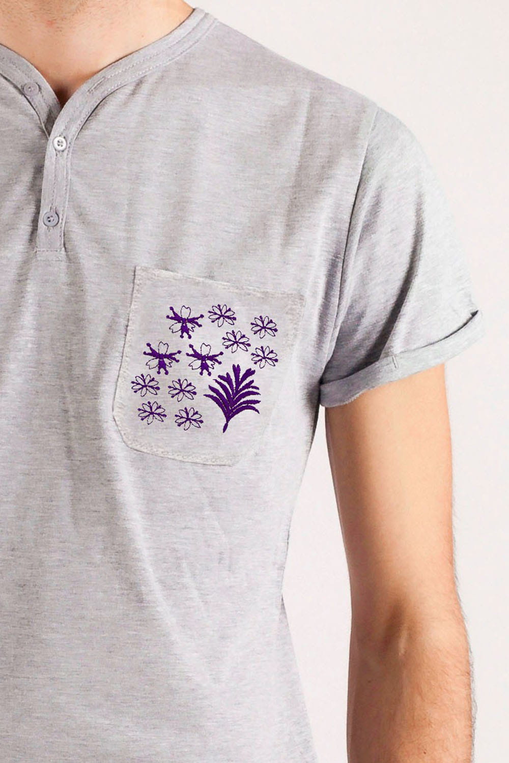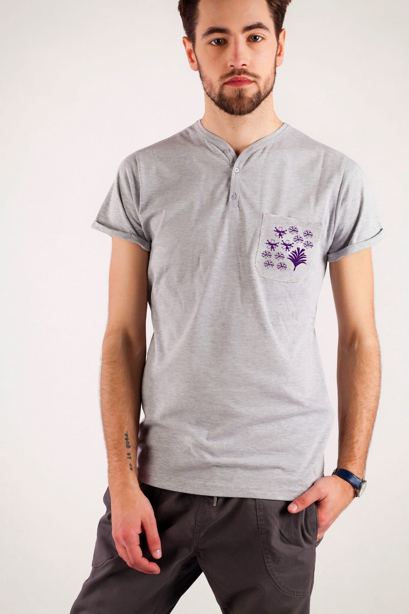 Koszulka w stonowanym szarym kolorze. Jest uszyta z cienkiej bawełny 100%, ma lekko taliowany krój, który podkreśla sylwetkę oraz eleganckie wykończenie dekoltu w kształcie litery V. Wzór na kieszonce pochodzi z regionu warmińskiego. Jest to tak zwana „palmeta”, czyli stylizowany liść palmy, który zdobił najczęściej damskie czepce. Używano do tego złotych lub srebrnych nici. Ta koszulka należy do naszej kolekcji Regiony Polski. |