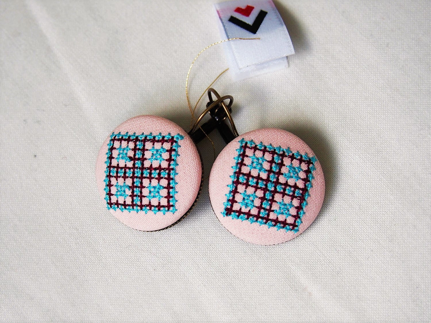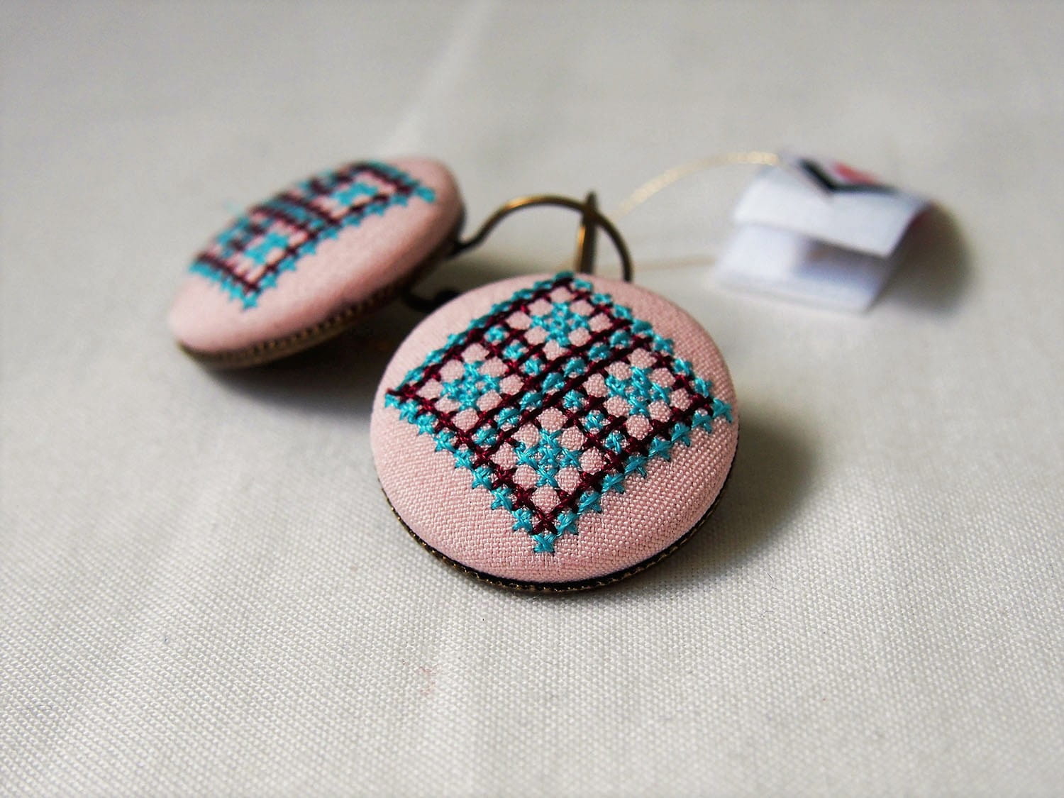 Kolczyki wiszące, ozdobione haftem z regionu kieleckiego. Wzór wyhaftowany turkusową i bordową nicią, techniką krzyżykową. Szerokość 25 mm, zapięcie angielskie wykonane z mosiądzu, nie zawiera niklu.