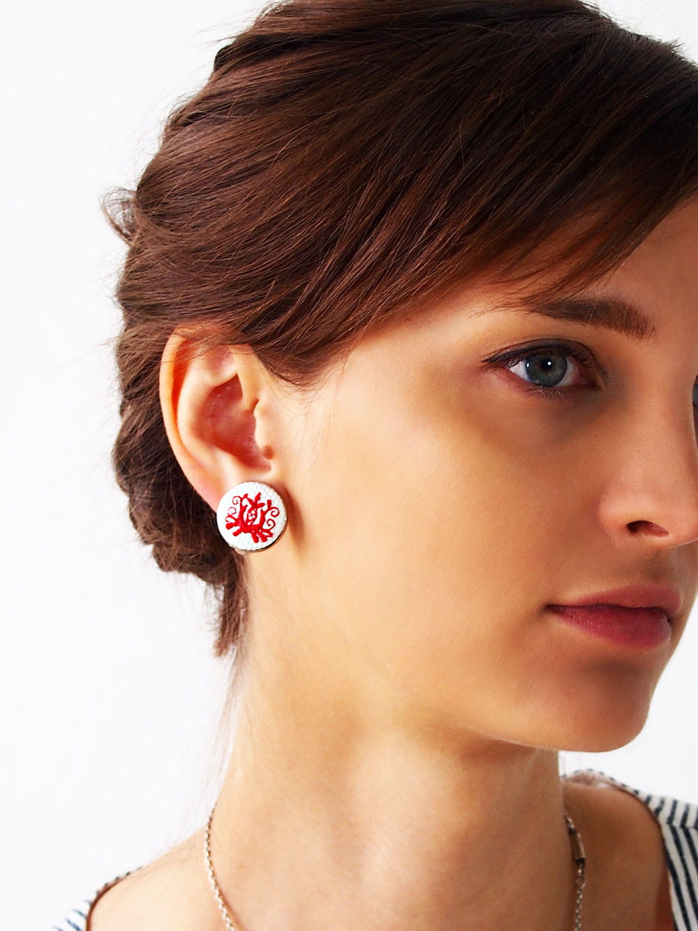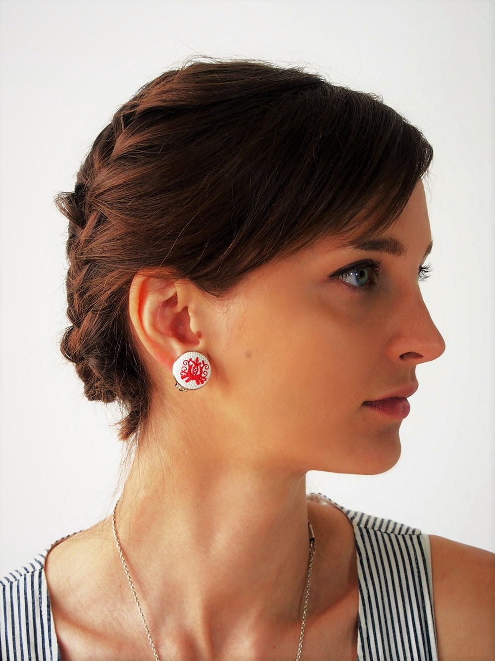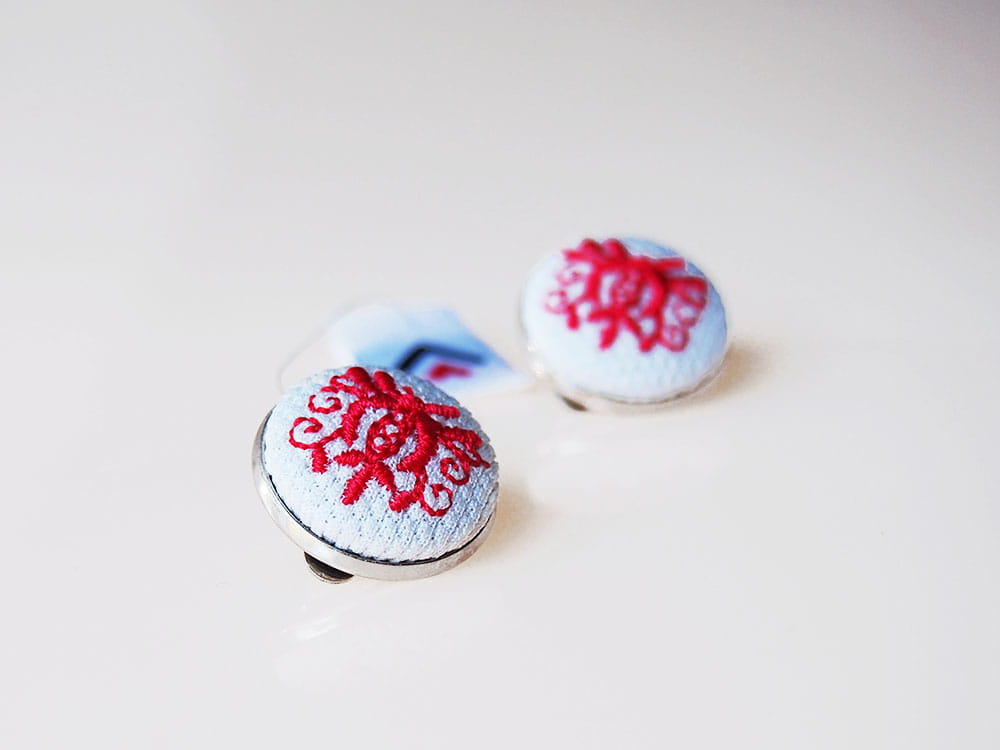Klipsy z efektownym haftem pochodzącym z regionu kaszubskiego. Haft został wykonany na białym materiale. Tradycyjne barwy kaszubskich haftów (niebieski, czerwony, żółty, zielony) zamieniliśmy na jednolity czerwony kolor. Zapięcie wykonane z mosiądzu w srebrnym kolorze, średnica 20 mm.