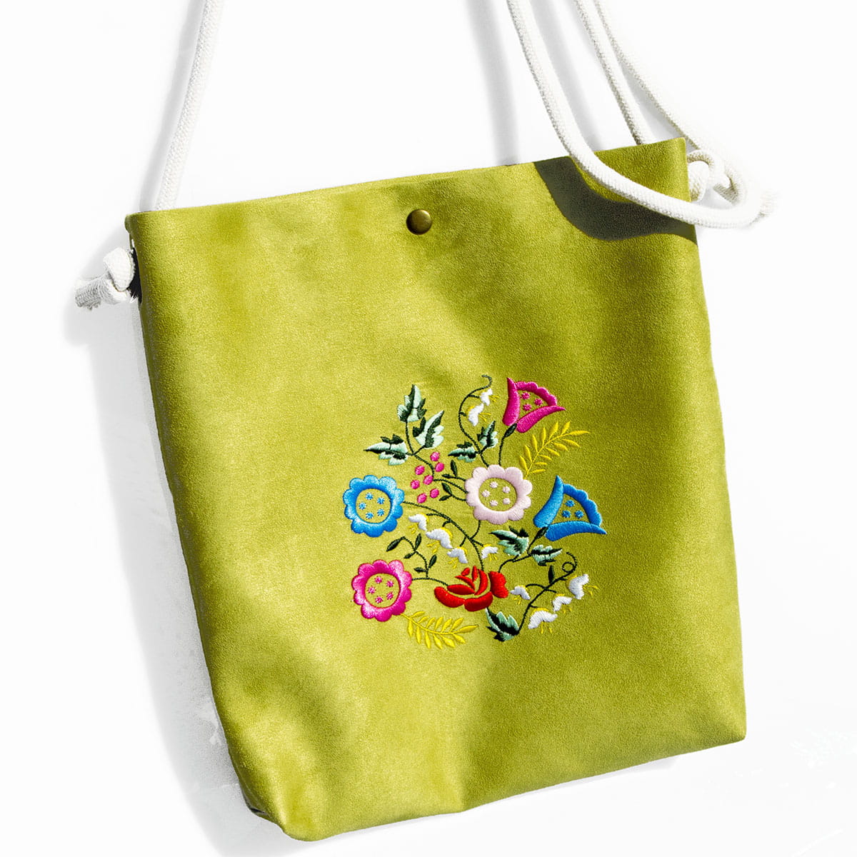 Torebka w klasycznym prostokątnym kształcie. Uszyta z jasnozielonego materiału, została ozdobiona ludowym haftem z regionu krakowskiego. Motyw został przeniesiony z dziewczęcego gorsetu. Torebka ma w środku podszewkę oraz kieszonkę na drobiazgi. Ta folkowa torebka to świetny dodatek do eleganckiej stylizacji! |