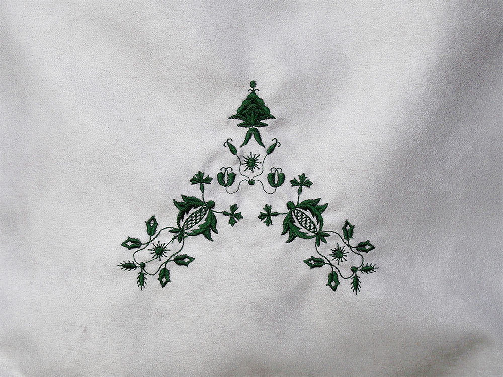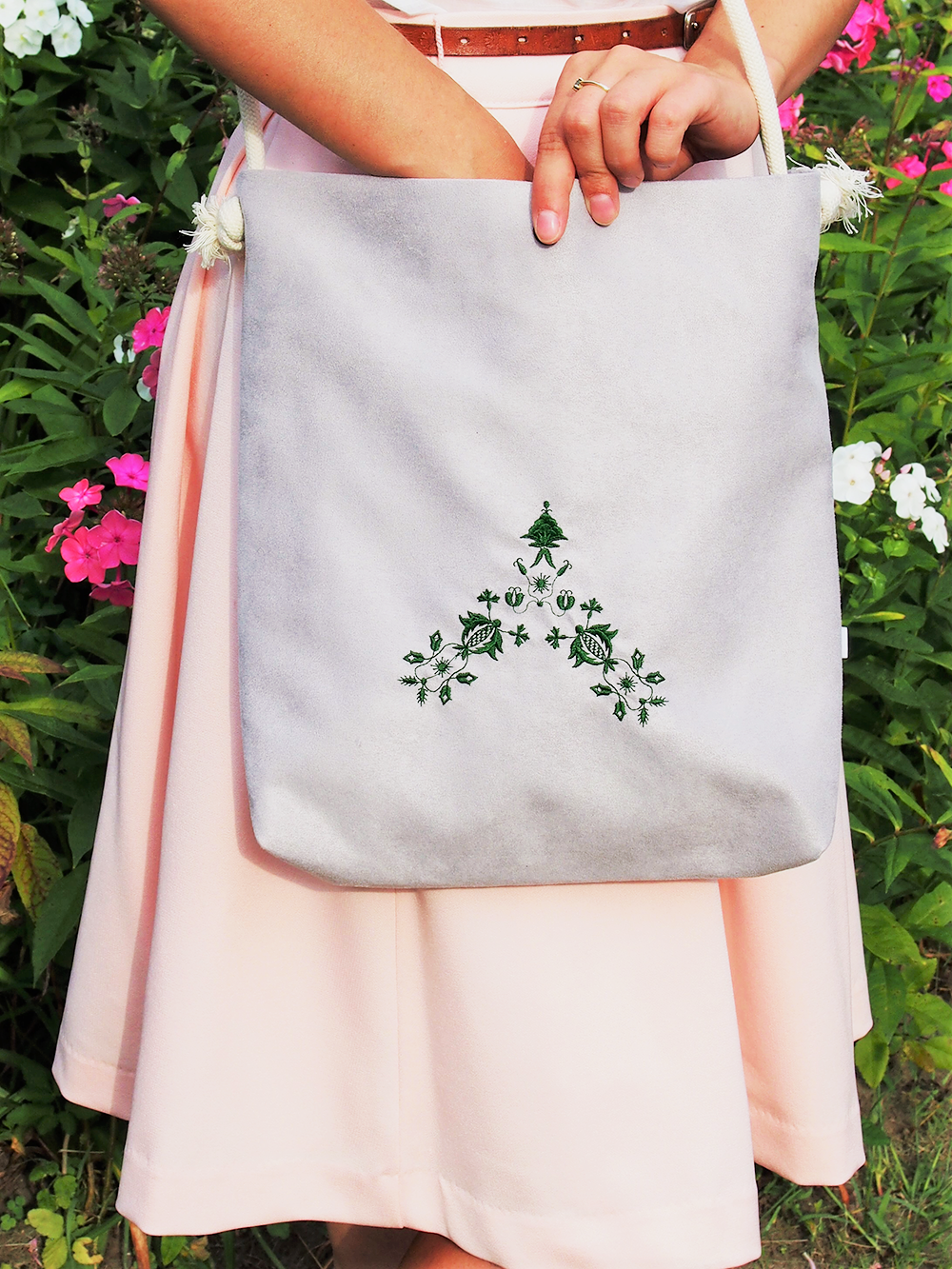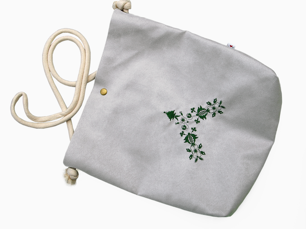 Folkowa torebka z haftem pochodzącym ze strojów kaszubskich. Torebka ma elegancki, jasnoszary kolor, a wnętrze podszyte jest podszewką w żywym, pomarańczowym kolorze. Na przedzie znajduje się znany w haftach kaszubskich motyw, przedstawiający koniczynę. Wykonany został ciemnozieloną nicią, dobrze widoczną na jasnym materiale. Torebka ma w środku niewielką kieszonkę. |