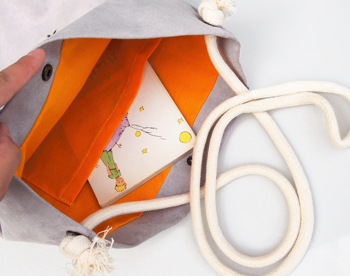 Szczegóły: Wymiary: wysokość 31cm, szerokość u góry ok. 29 cm, u podstawy ok. 25cm (+/- 2cm), szerokość dna ok. 6 cm, długość ramienia ok. 1,5m Materiał: imitacja zamszu, sznur bawełniany Zapięcie na zatrzask, w środku podszewka i kieszonka, |