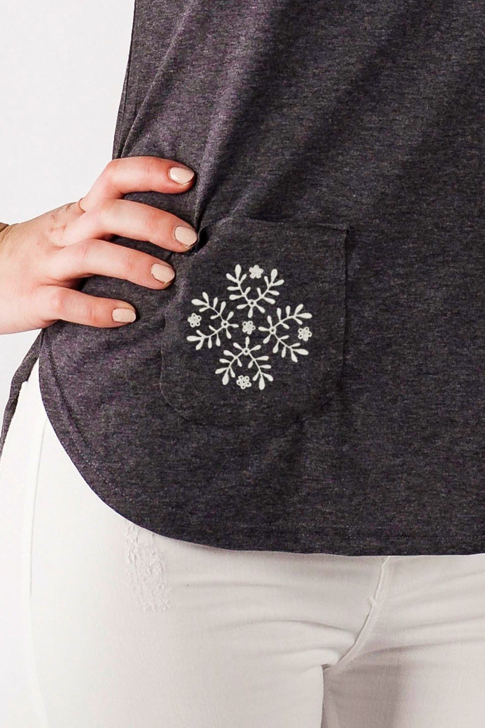 Folkowa koszulka z regionalnym wzorem pochodzącym z zachodniej części Krakowa. Kobiecy, taliowany t-shirt został uszyty z wysokiej jakości bawełny w grafitowym kolorze. Dekolt w kształcie łódki jest pogłębiony na plecach. Ozdobą koszulki są dwie kieszonki z ludowym motywem. Na ciemnym tle odcina się haft, zainspirowany tradycyjnymi haftami płaskimi w kształcie gałązek, które tradycyjnie zdobiły przody męskich koszul. Haft dostępny w kilku kolorach. |