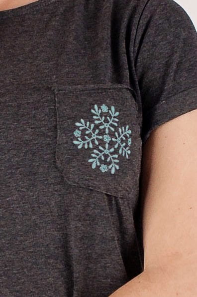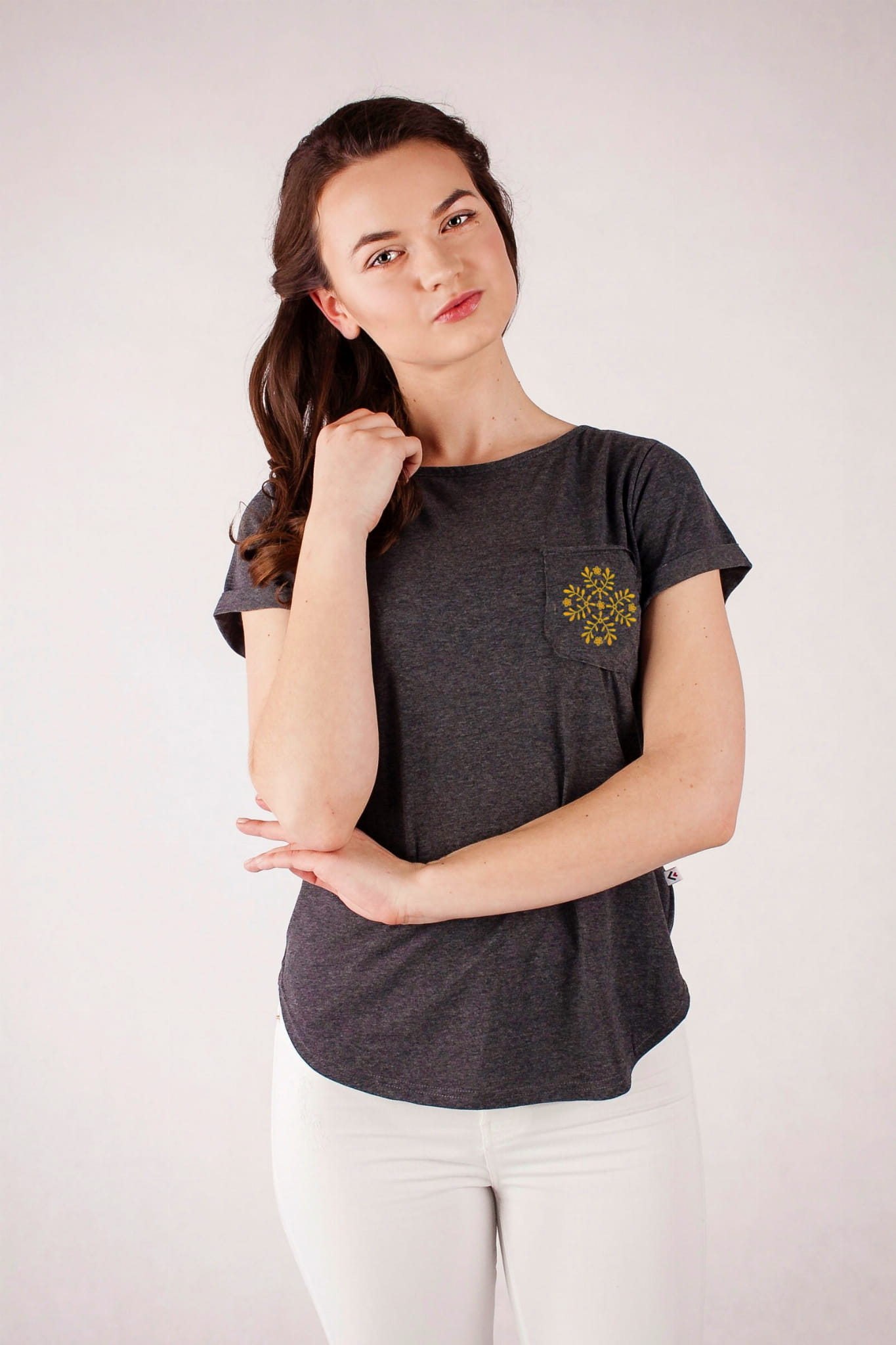 Koszulka z regionalnym wzorem pochodzącym z zachodniej części Krakowa. Kobiecy, taliowany t-shirt został uszyty z wysokiej jakości bawełny w grafitowym kolorze. Dekolt w kształcie łódki jest pogłębiony na plecach. Na ciemnym tle odcina się haft, zainspirowany tradycyjnymi haftami płaskimi w kształcie gałązek, które tradycyjnie zdobiły przody męskich koszul. Haft dostępny w kilku kolorach. |