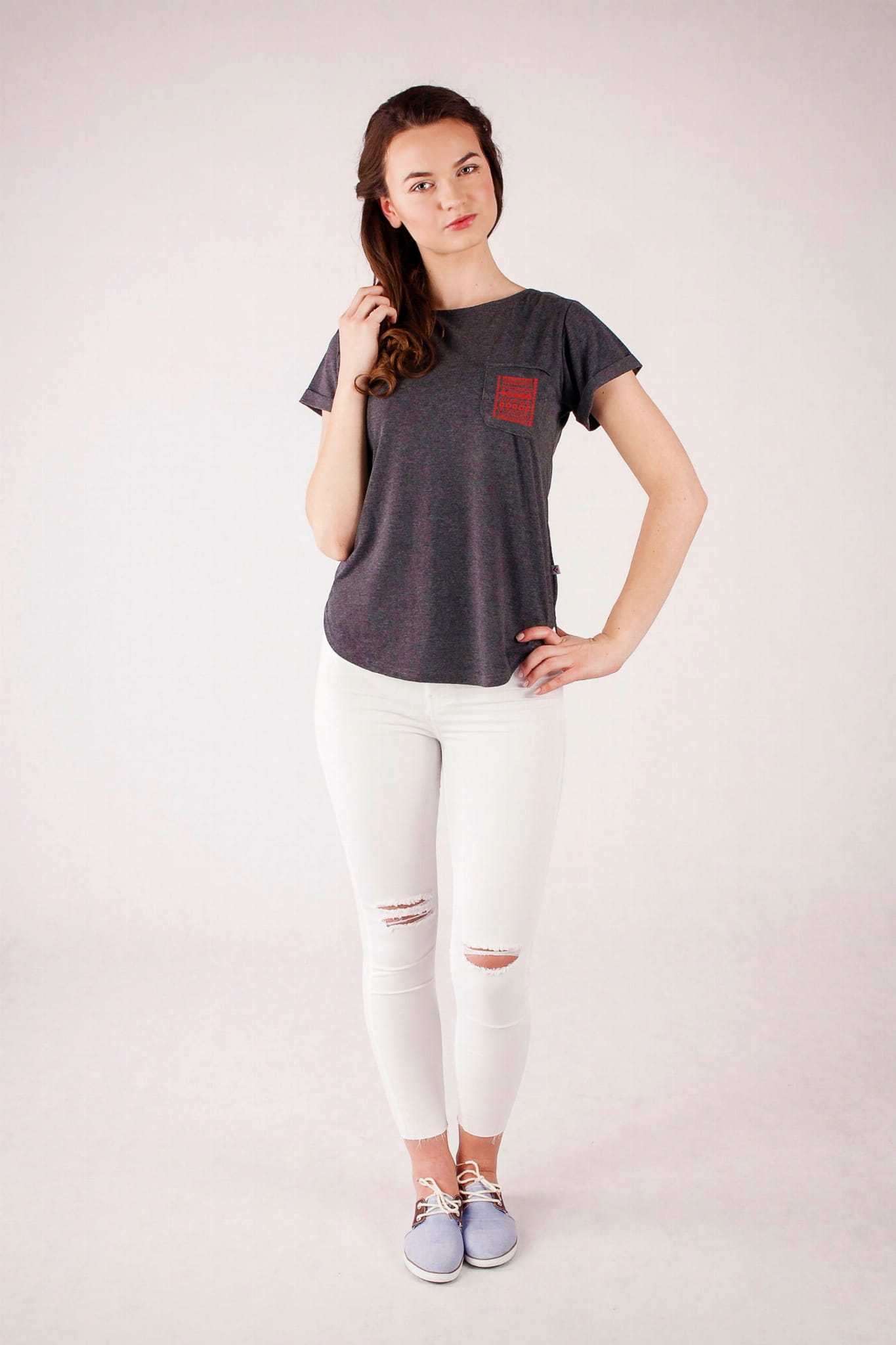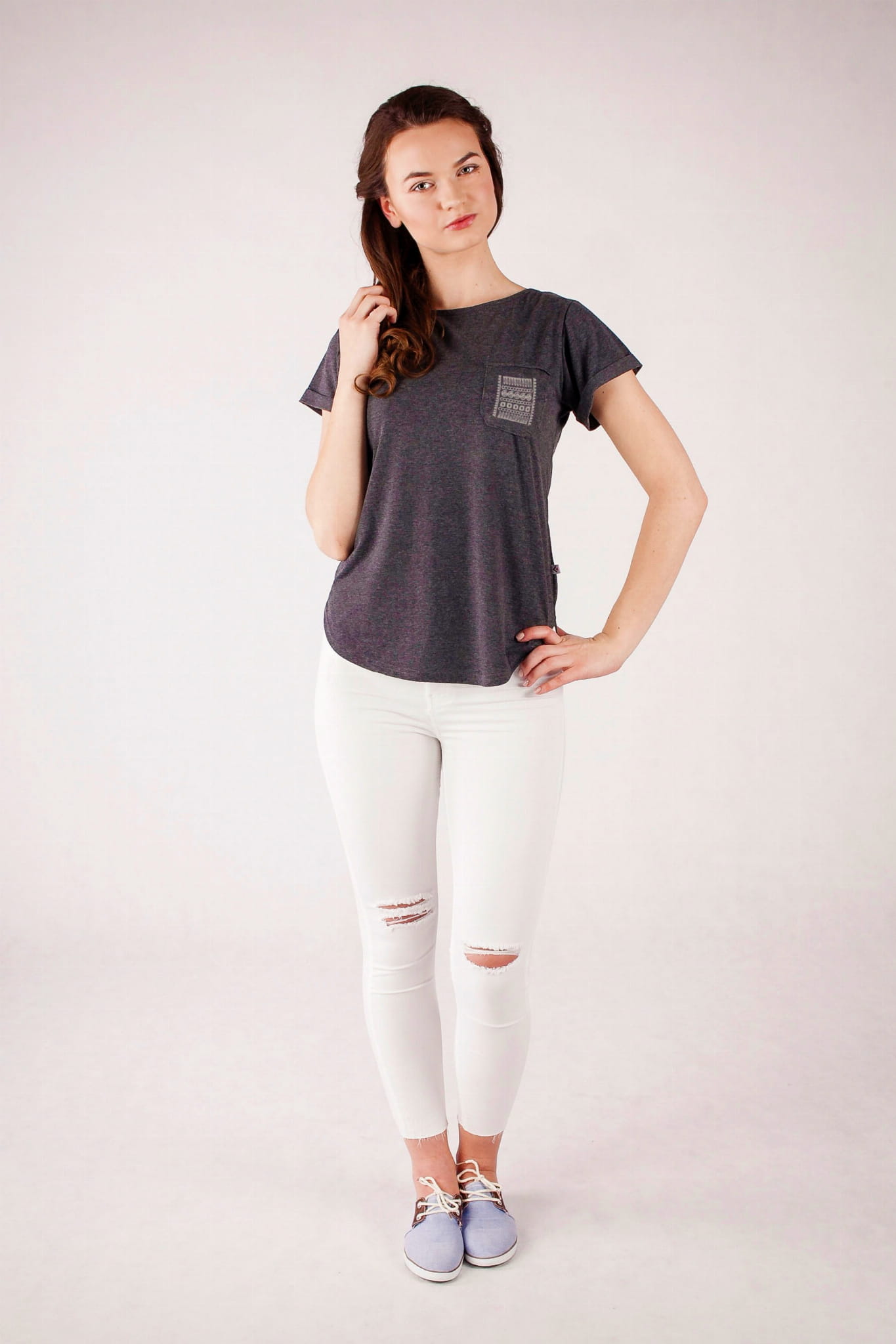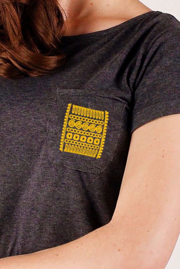 Elegancki grafitowy kolor i cienka bawełna 100% to świetny pomysł na ciekawą, letnią stylizację. Najważniejszym elementem koszulki jest kieszonka ozdobiona haftem z regionu rzeszowskiego. Kieszonka jest wypełniona geometrycznym jednokolorowym wzorem składającym się ze ślimaczków, zygzaków, linii. Krój koszulki jest lekko taliowany, dekolt został wycięty w łódkę, z pogłębieniem na plecach. Nietypowy fason w połączeniu z ludowym designem tworzą razem bardzo oryginalną całość. |