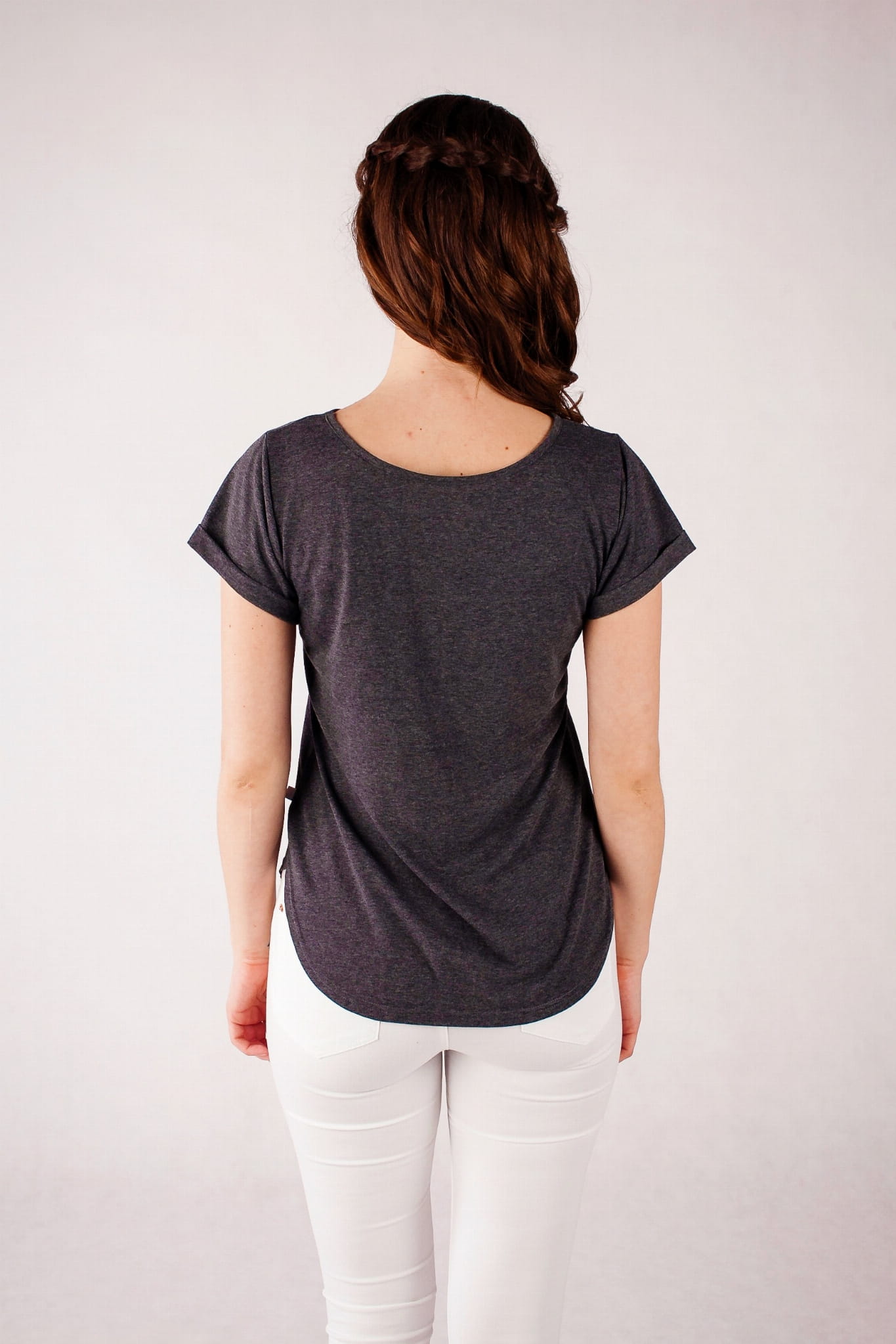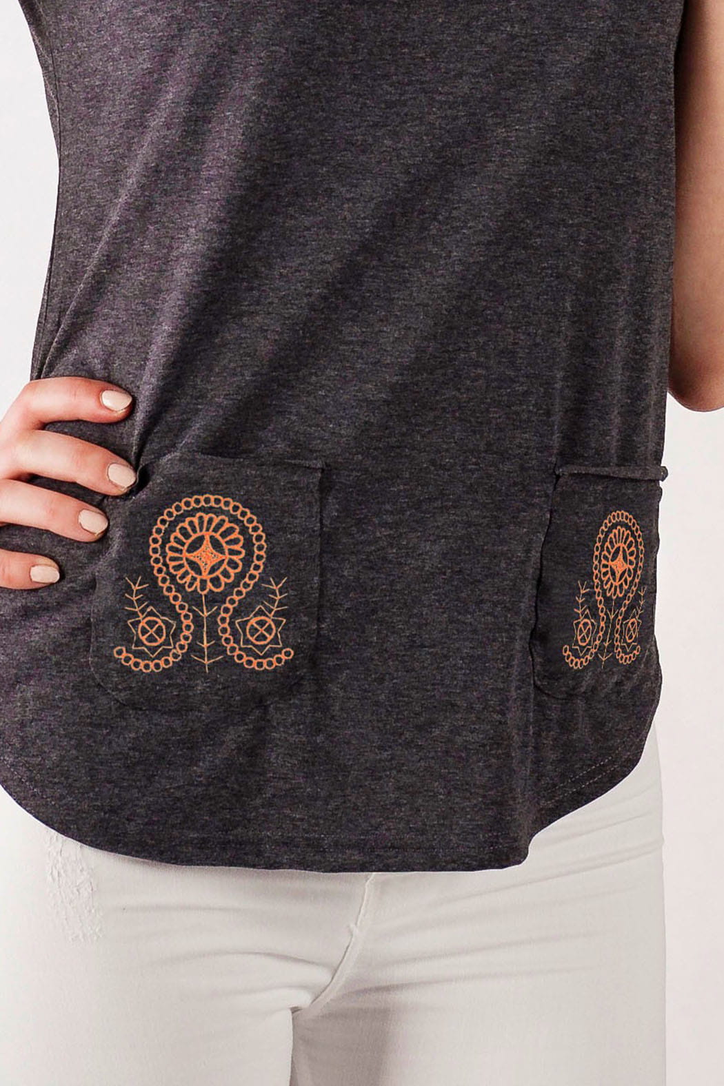 Folk koszulka w eleganckim, grafitowym kolorze. Dwie urocze kieszonki są ozdobione haftem wielkopolskim, pochodzącym z ważnego dla kultury tego regionu ośrodka, tj. Szamotuł. W tradycyjnej wersji tego rodzaju hafty wykonywano na tiulu. Stąd lekka i ażurowa struktura wzoru. Koszulka została uszyta z bawełny 100%, ma podwinięte rękawki i dekolt w kształcie łódki, z pogłębianym wycięciem na plecach. |