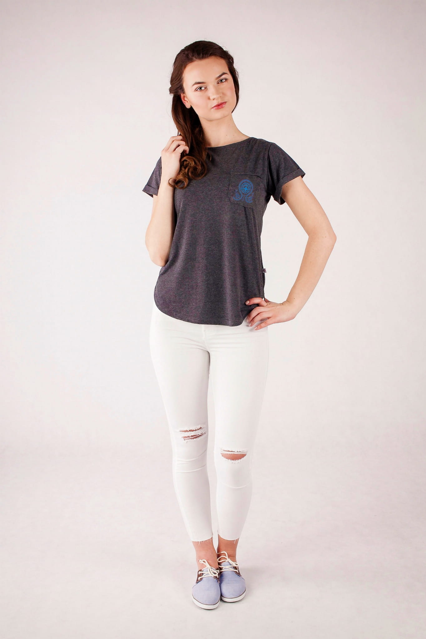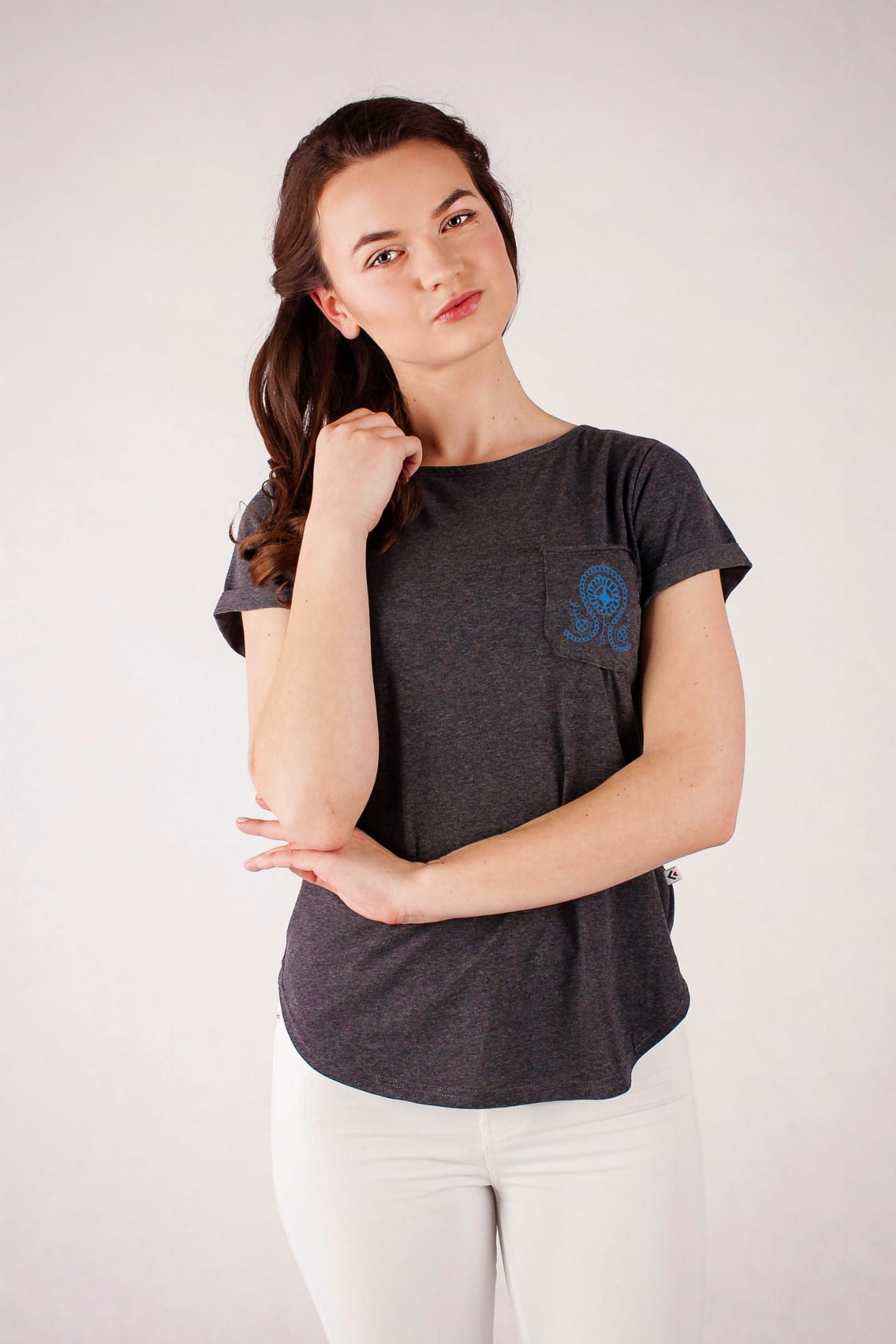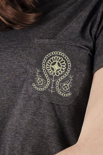 Folk koszulka w eleganckim, grafitowym kolorze. Kieszonka jest ozdobiona haftem wielkopolskim, pochodzącym z ważnego dla kultury tego regionu ośrodka, tj. Szamotuł. W tradycyjnej wersji tego rodzaju hafty wykonywano na tiulu. Stąd lekka i ażurowa struktura wzoru. Koszulka została uszyta z bawełny 100%, ma podwinięte rękawki i dekolt w kształcie łódki, z pogłębianym wycięciem na plecach. |