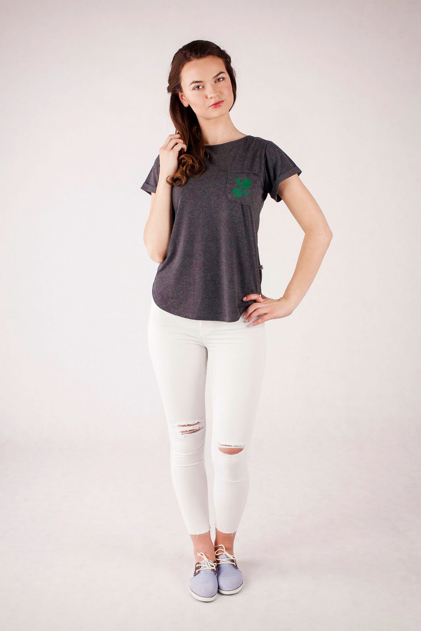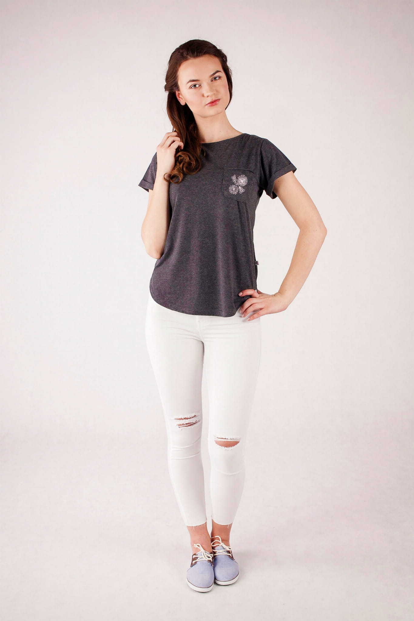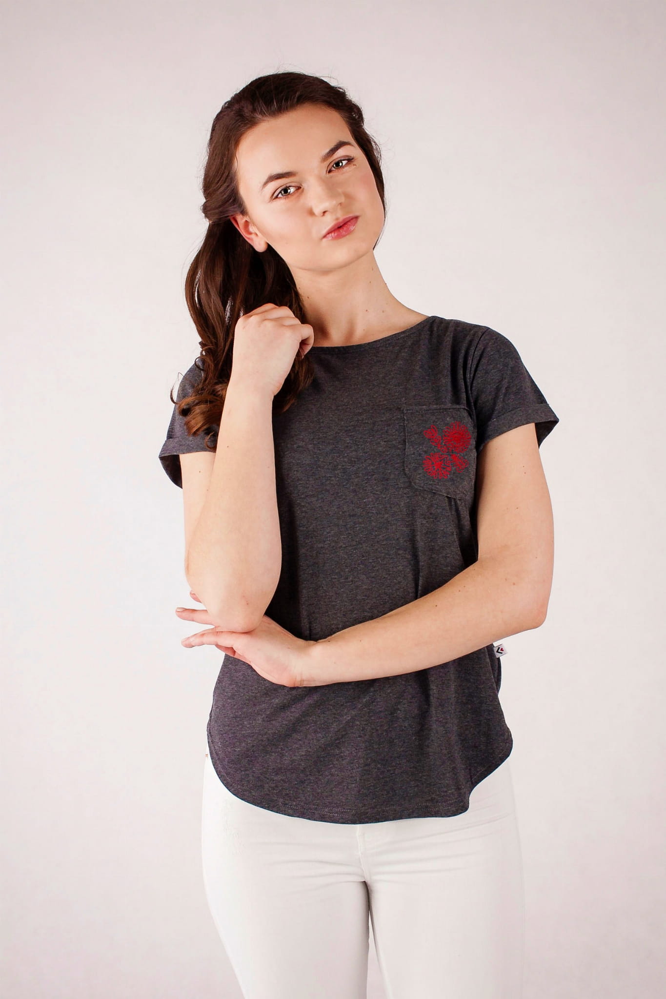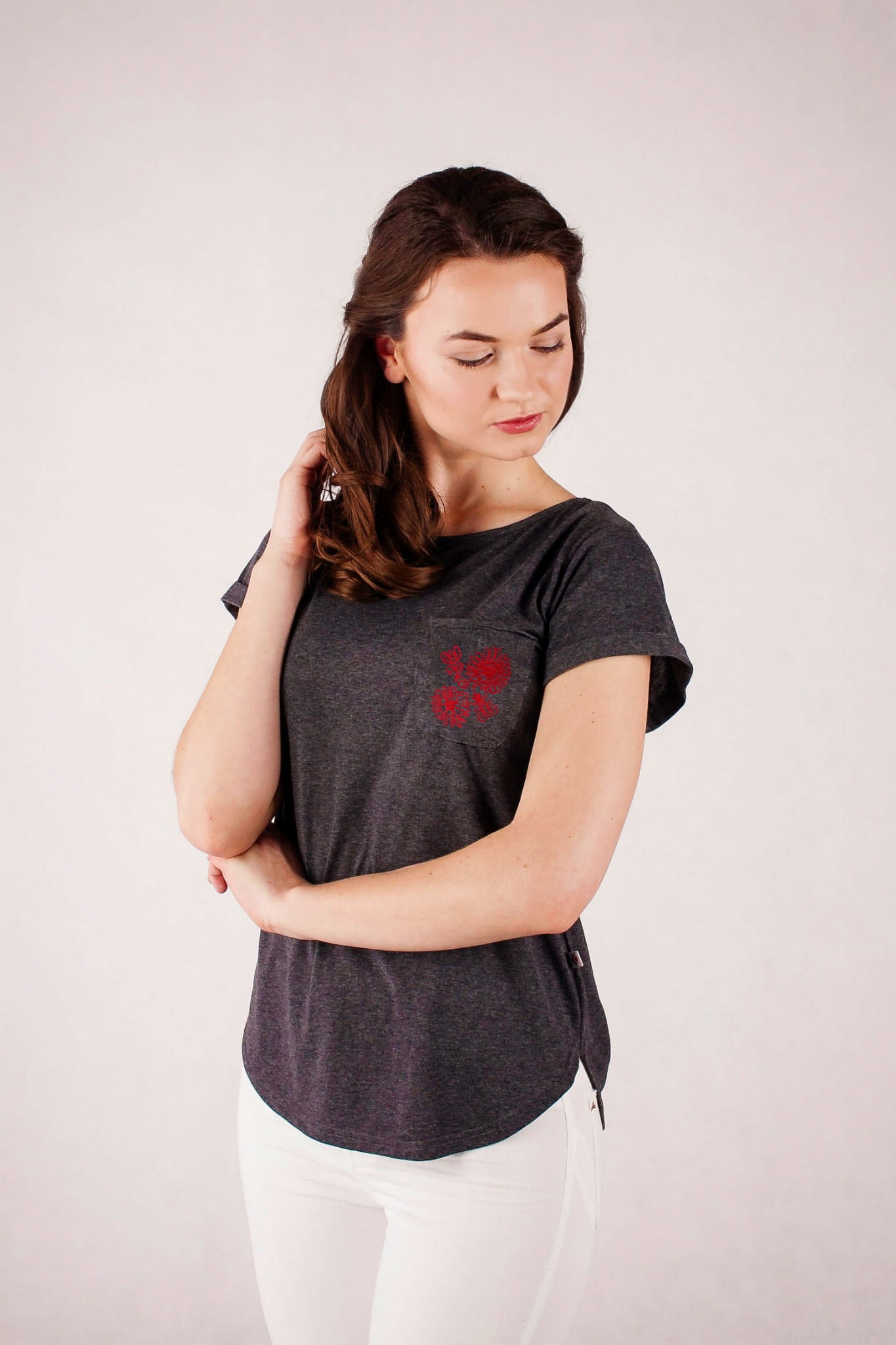 T-shirt z kolekcji Regiony Polski. Grafitowa barwa bawełny jest dopełniona jednokolorowym haftem w kontrastowym kolorze. Na kieszonce umieściliśmy haft inspirowany strojami regionalnymi z Wilanowa. Hafty wilanowskie były w oryginale wykonywane w całości jednym ściegiem - łańcuszkiem, zazwyczaj w czarnym lub ciemnobrązowym kolorze. Najczęściej były to stylizowane kwiaty ułożone w rytmiczne sekwencje. T-shirt ma kobiecy, lekko taliowany fason. Dekolt w kształcie łódki jest pogłębiony na plecach. |
