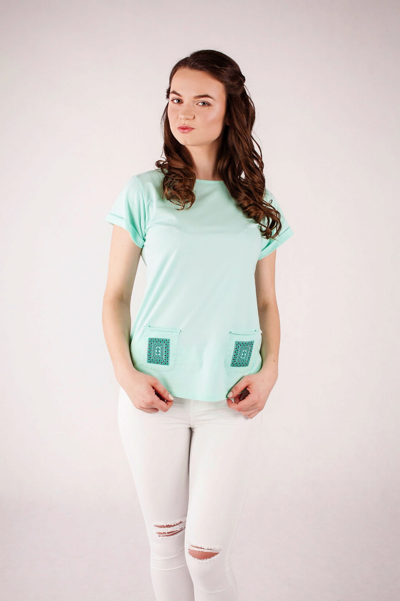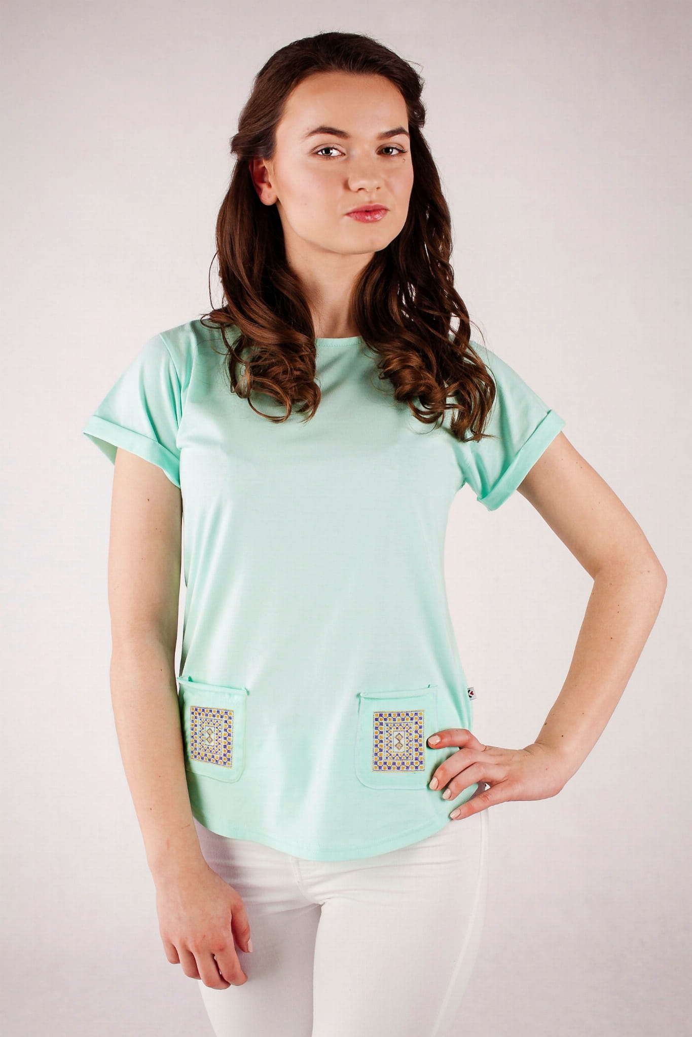 Pastelowy jasny kolor i cienka bawełna 100% to świetny pomysł na ciekawą, letnią stylizację. Wzrok przyciągają dwie urocze kieszonki, na których znajdują się haftowane motywy z regionu kieleckiego. Haft jest geometryczny i dwukolorowy, wykonany techniką krzyżykową. Krój koszulki jest lekko taliowany, dekolt został wycięty w łódkę, z pogłębieniem na plecach. Nietypowy fason w połączeniu z ludowym designem tworzą razem bardzo oryginalną całość. |