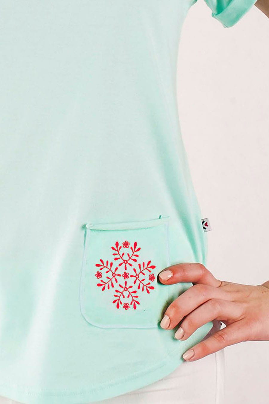 Wyjątkowy folkowy t-shirt z haftowanymi motywami. Koszulka jest uszyta z bawełny 100% w jasnym, pastelowo-miętowym kolorze. Lekko taliowany krój podkreśla sylwetkę, a wykończenie dekoltu i rękawków dodaje jej kobiecego charakteru. Na dwóch symetrycznych kieszonkach znajduje się haft z regionu krakowskiego, który tradycyjnie ozdabiał przodu męskich koszul i był zawsze wykonywany białą nicią. Motyw gałązek ułożyliśmy w symetryczny kształt, wpasowujący się w kieszonkę. Haft dostępny w kilku kolorach! |