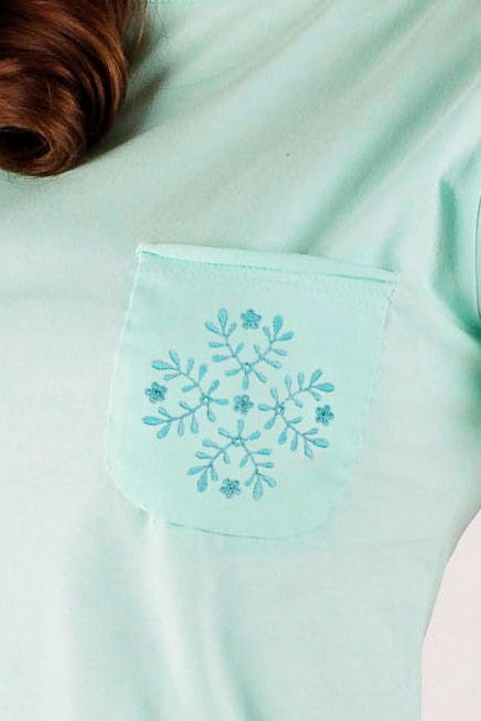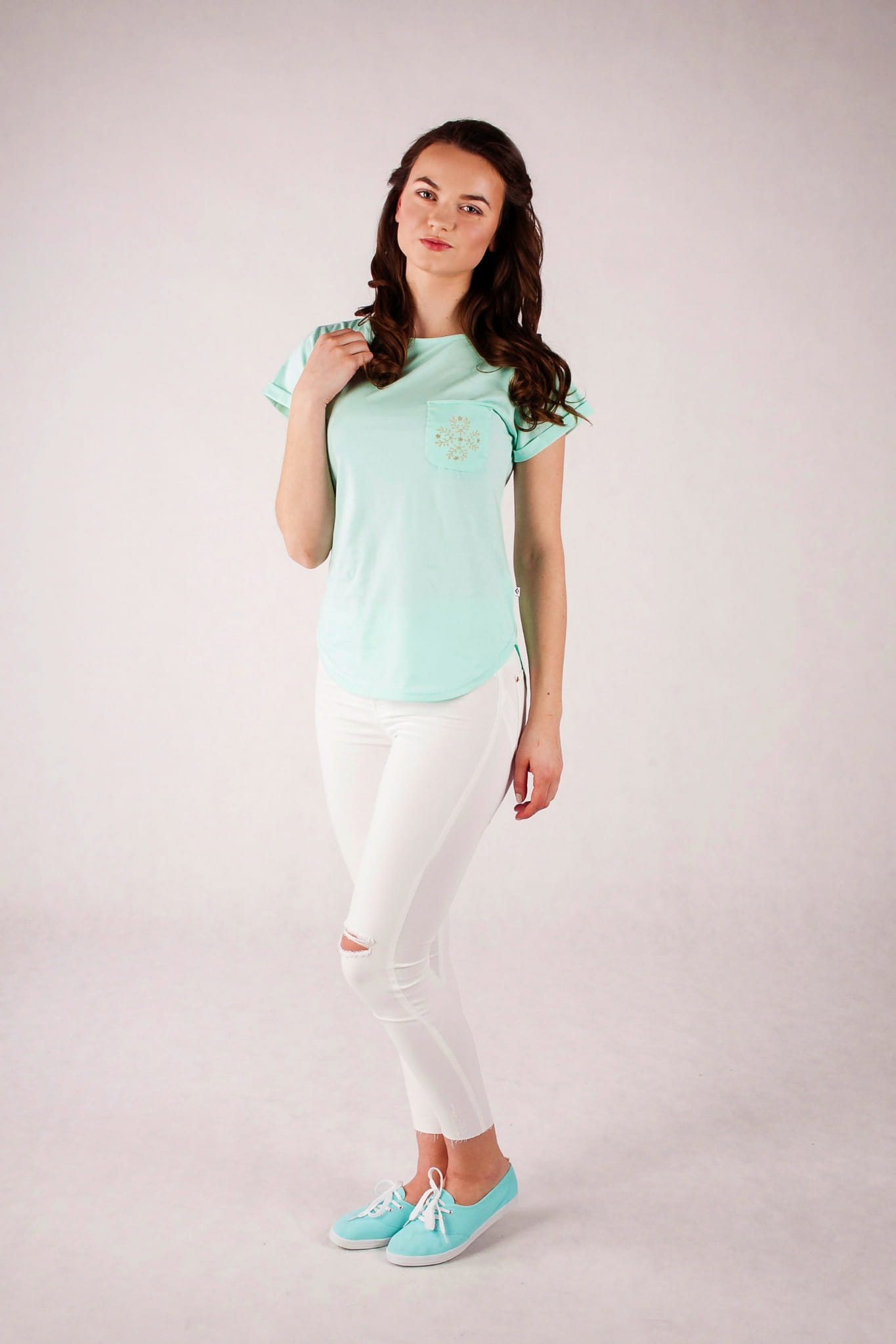 Wyjątkowy t-shirt z haftowanym motywem. Koszulka jest uszyta z bawełny 100% w jasnym, pastelowo-miętowym kolorze. Lekko taliowany krój podkreśla sylwetkę, a wykończenie dekoltu i rękawków dodaje jej kobiecego charakteru. Na kieszonce znajduje się haft z regionu krakowskiego, który tradycyjnie ozdabiał przodu męskich koszul i był zawsze wykonywany białą nicią. Motyw gałązek ułożyliśmy w symetryczny kształt, wpasowujący się w kieszonkę. Haft dostępny w kilku kolorach! |