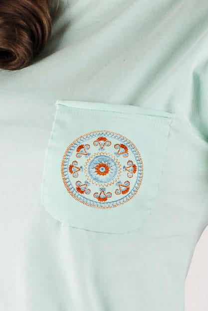 Letnia folkowa propozycja to miętowy t-shirt z haftowaną kieszonką. Motyw pochodzi z regionu kurpiowskiego (Puszcza Biała). Wzór na kieszonce to tzw. "zielko", które pierwotnie wykonywane było czerwoną nicią z czarnym podkreśleniem. T-shirt jest uszyty z bawełny 100%. Dekolt wycięty w kształt łódki, jest pogłębiony na plecach. Haft dostępny w dwóch wersjach kolorystycznych. |