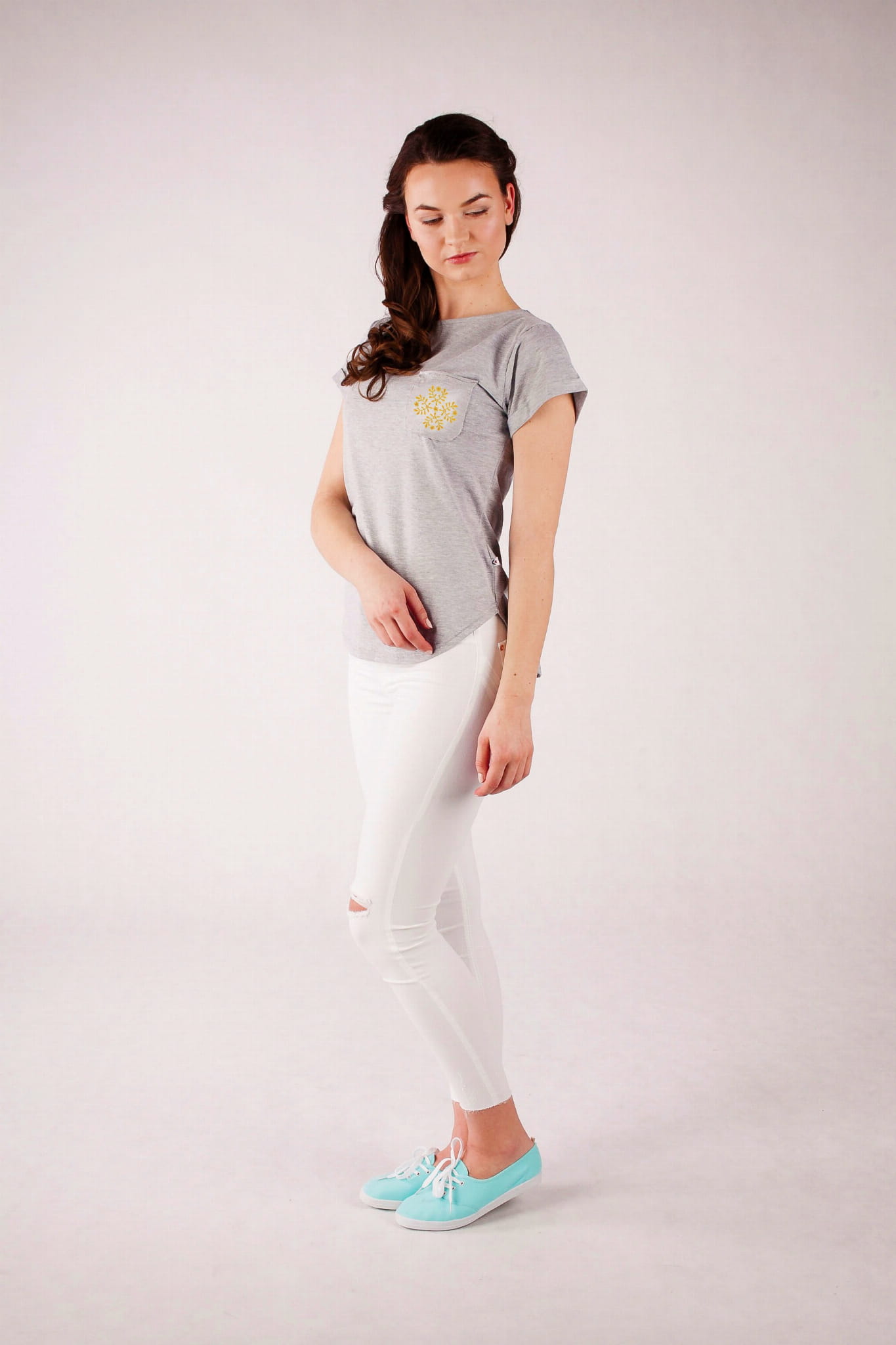 Folkowy t-shirt w jasnoszarym kolorze. Lekko taliowany fason i dekolt wycięty w łódkę sprawiają, że koszulka ma dziewczęcy wyraz. Na kieszonce znajduje się haft z regionu krakowskiego, który tradycyjnie ozdabiał przodu męskich koszul i był zawsze wykonywany białą nicią. Motyw gałązek ułożyliśmy w symetryczny kształt, wpasowujący się w kieszonkę. Haft dostępny w kilku kolorach! |