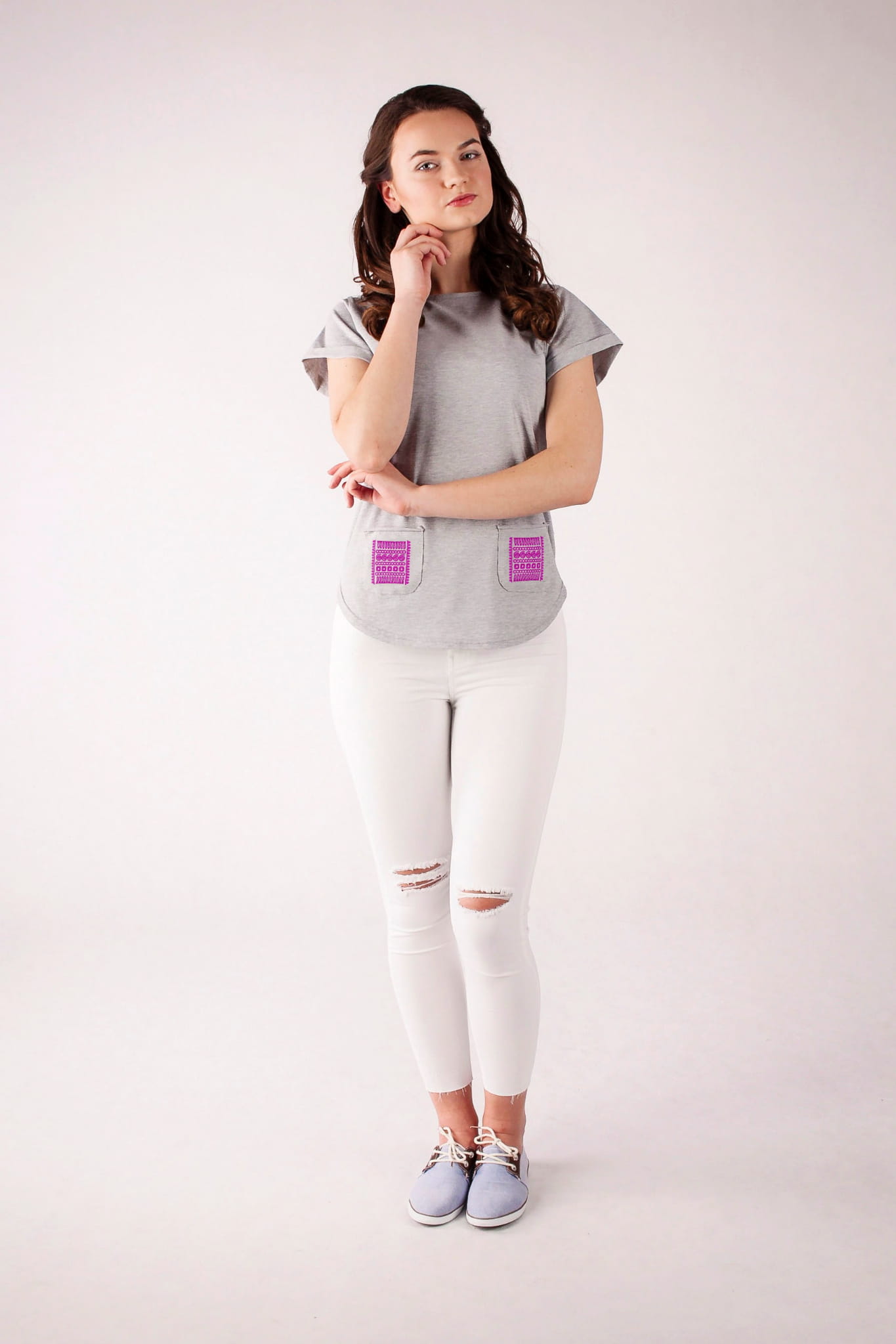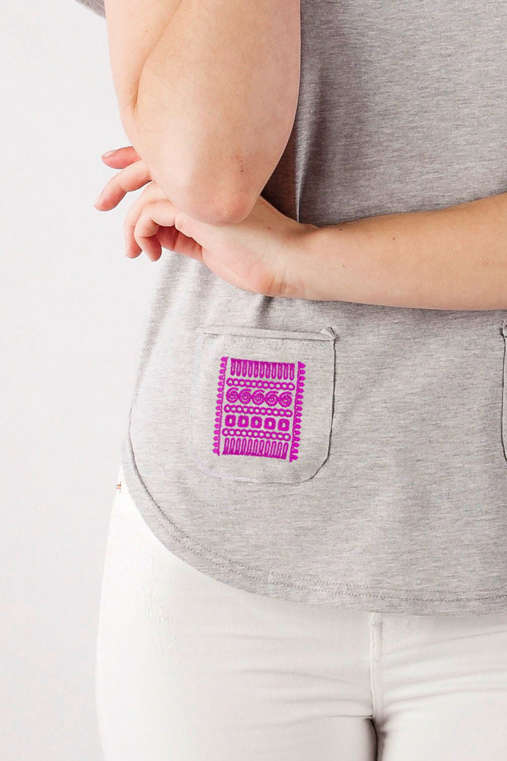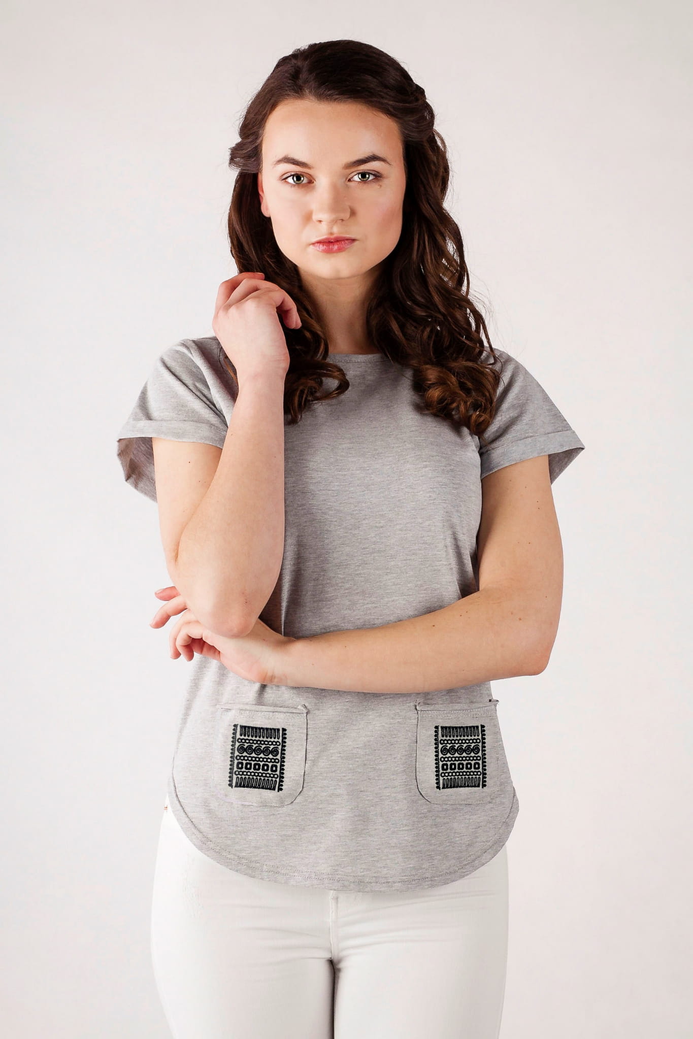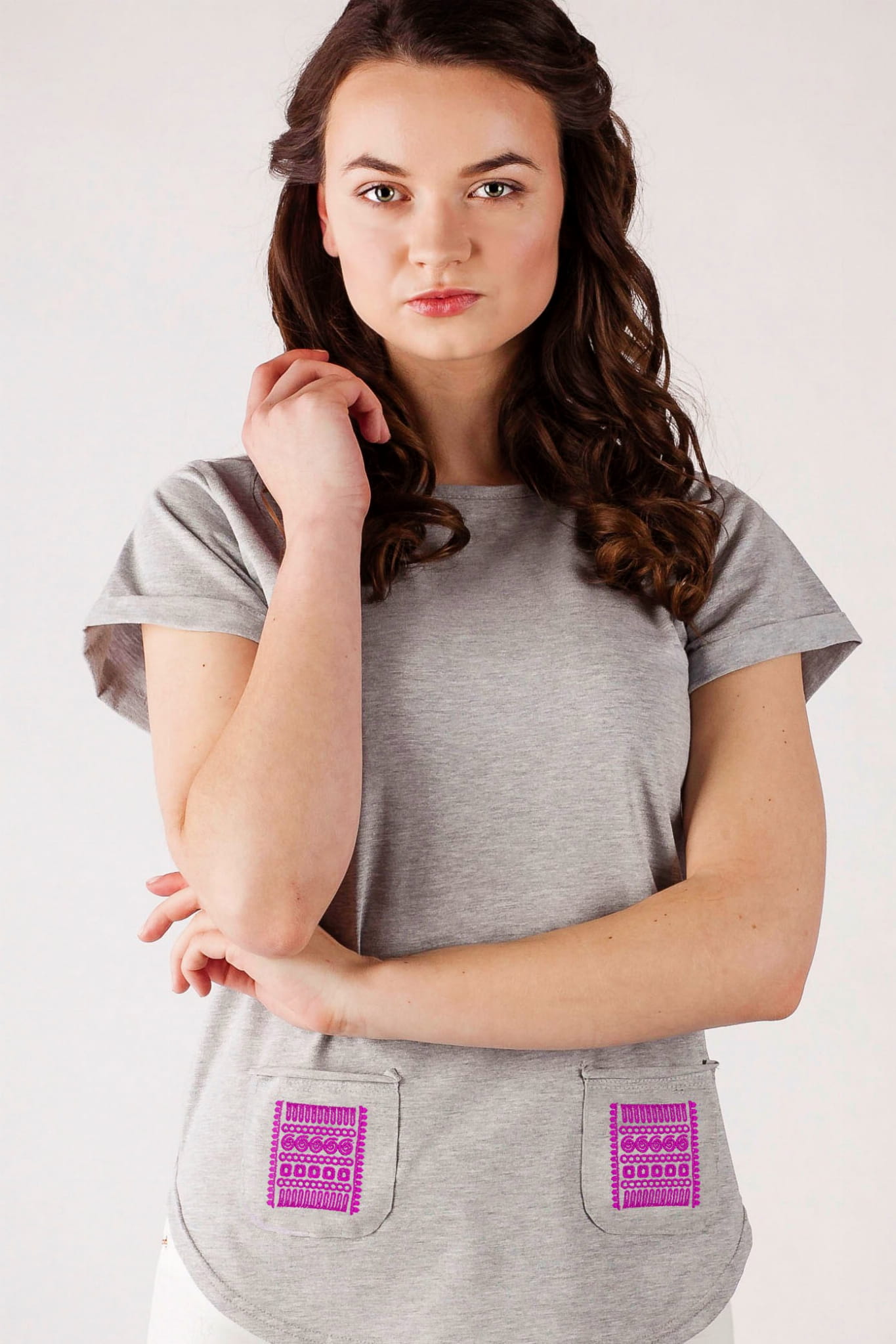 Koszulka z ludowym haftem z okolic Rzeszowa. Prostokątny haft wypełnia dwie symetryczne kieszonki. Geometryczne wzory: zygzaki, kółeczka, ślimaki pochodzą z regionalnych strojów rzeszowskich. T-shirt jest uszyty z bawełny 100%, która dzięki naturalnemu składowi świetnie sprawdzi się latem. Bluzka ma dekolt wycięty w łódkę, z pogłębionym wcięciem na plecach. Sprawdź wszystkie wersje kolorystyczne! |